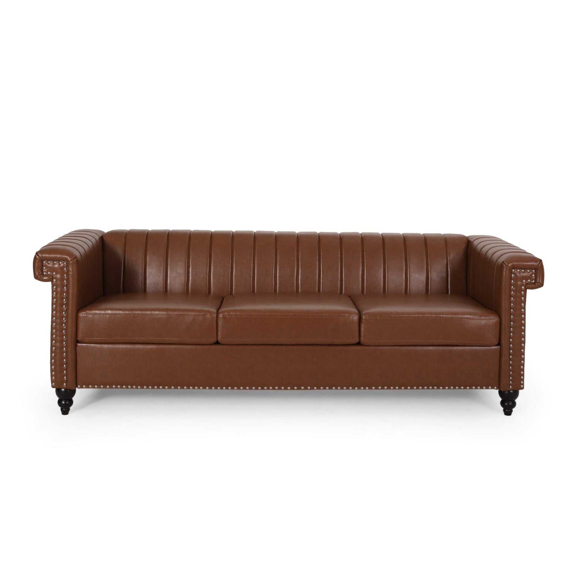 Details: From eye-catching style to outstanding comfort, our intimate yet sophisticated sofa has it all. Perfectly balancing smooth upholstery with sturdy birch wood legs, this impressive three-seater sofa offers your home a charming contemporary upgrade. This piece offers graceful channel stitching and is finished with a dazzling nailhead trim, making this a streamlined statement piece that can change the whole flow of your living room. Completed with lovely turned legs, this refined sofa will turn any interior space into a stunning masterpiece. Material: Faux Leather Leg Material: Birch Wood Multiple Color Options Hand-Crafted Details Assembly Required Dimensions: 32.50 inches deep x 83.00 inches wide x 27.00 inches high Seat Dimensions: 22.25 inches deep x 68.00 inches wide x 18.75 inches high Arm Height: 27.00 inches