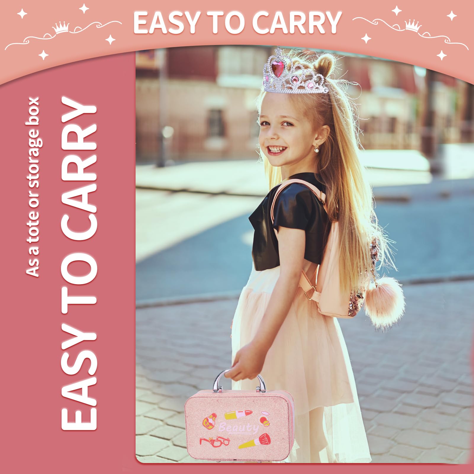 - 【Easy Storage & Portable Kids Makeup Case 】 Our kids makeup set with cosmetic bag. All the items come packed in the cosmetic bag for easy storage. With the cosmetic bag with mirror, your little one can bring the little makeup case to travel and touch up makeup anytime.