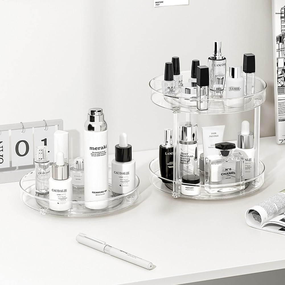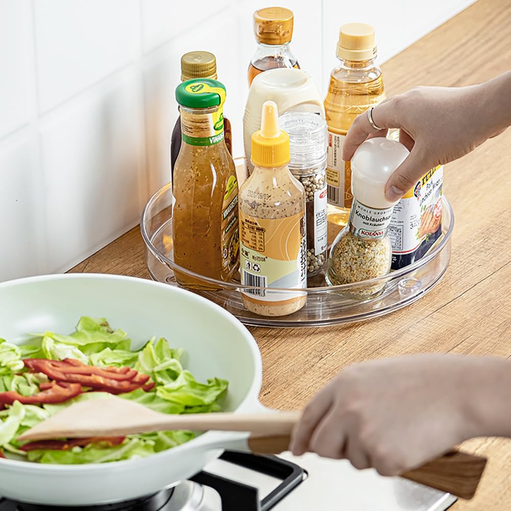 - 【Ideal Size & Space Save】-- Come with 1 tier + 2 tier clear rotating organizer, customize your space by using these kitchen cabinet organizer. For kitchen countertop, you can organize condiments such as bottles, spice jars, etc. For pantry, you can organize drinks, snacks, canned goods, etc. For bathroom or vanity, you can organize toiletries and cosmetics. For refrigerator, you can organize foods such as fruits, vegetables, etc.