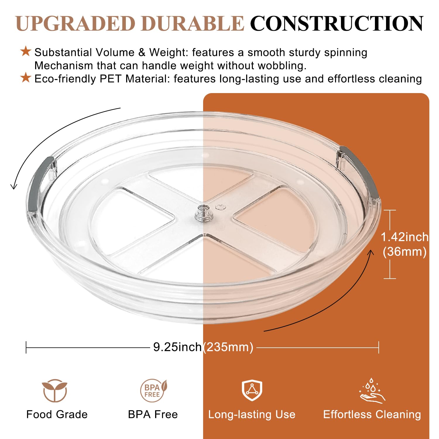 - Efficient Space Utilization: Measuring 9.25 x 9.25 x 1.42 inches, our 4 pack lazy susan turntable is perfect for organizing a variety of items. Whether you need to arrange 8-12 beauty products on your vanity, spices in your kitchen cabinet, or condiments in your refrigerator, this compact design helps you maximize space and keep everything within easy reach.