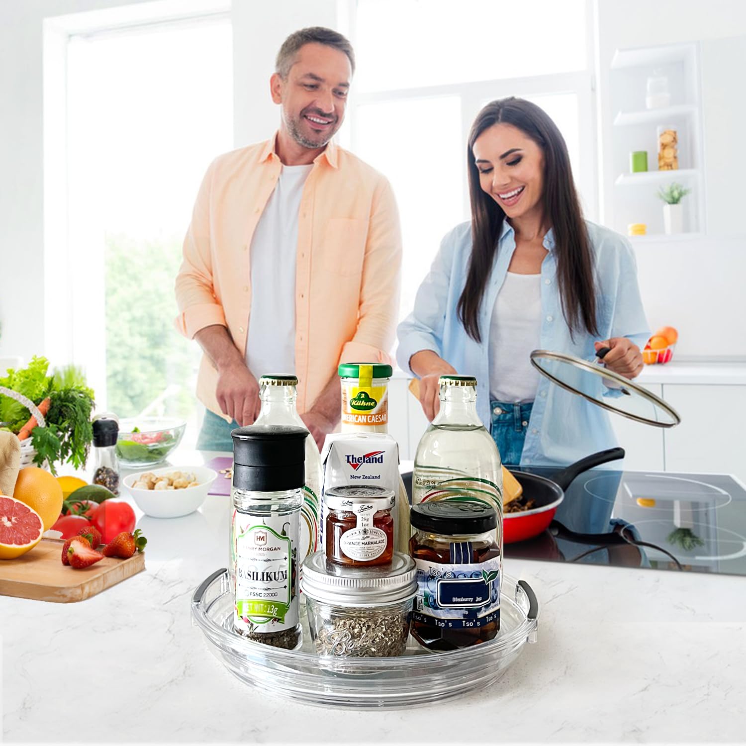 - Strong & Sturdy Materials: Built to last, our lazy susan spice rack is crafted from high-quality PET, BPA-free plastic, not only sturdy but also ensure stability and safety for your items. With its functional 1.5-inch high round eages and layered substantial base to prevent falling, whether in your kitchen, bathroom, or office, trust it to securely hold your items! Hand wash recommended and dry completely for long-lasting use.