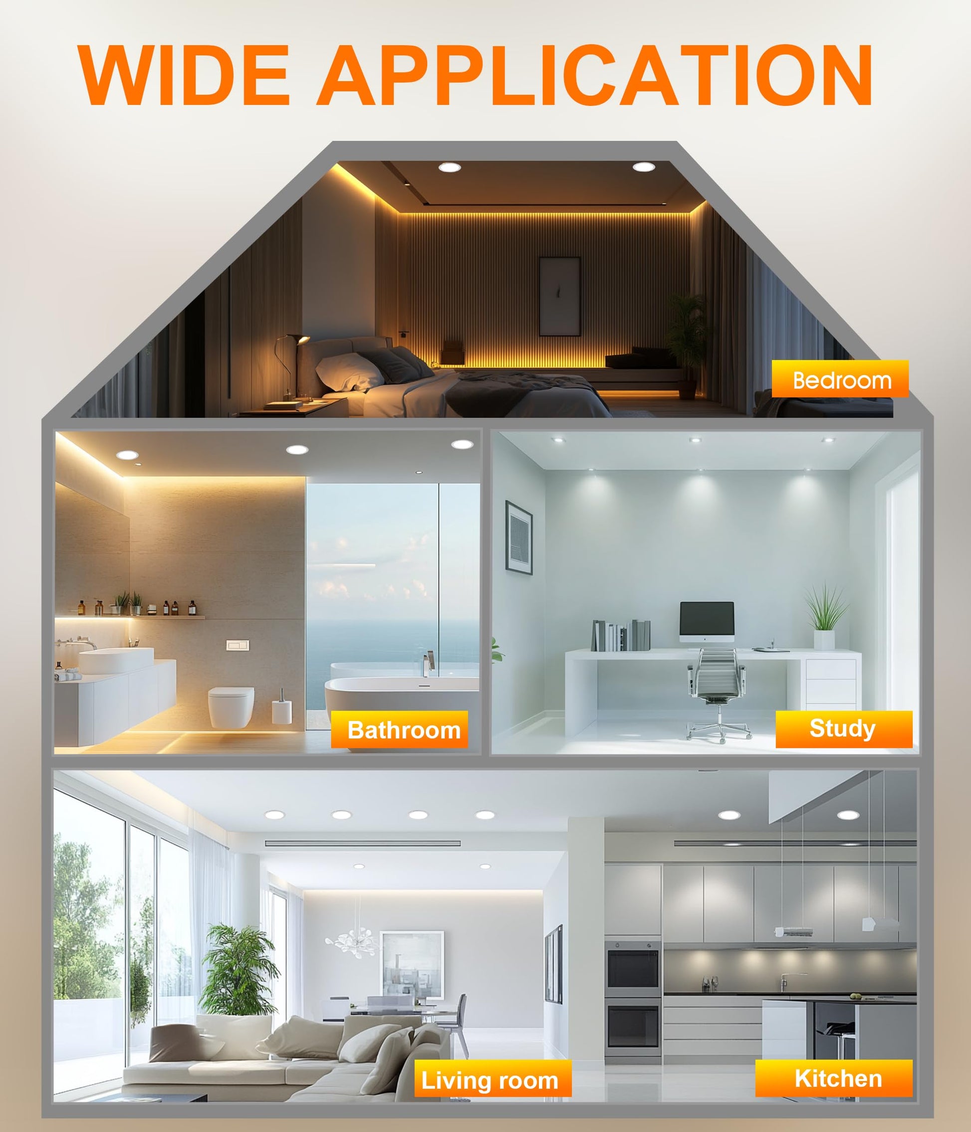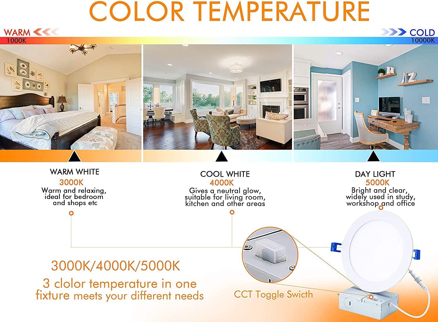 - Adjustable color temperature & dimmable brightness - LED Recessed Downlight gives you 3 color temperature options: 3000K,4000K and 5000K. You can use the CCT color temperature adjustable switch to change the color temperature from warm yellow light to cold white light easily and smoothly. Also you can adjust the brightness of the light from 5% to 100% according to different time and occasion. Different color temperature and brightness can meet your different ambience needs.