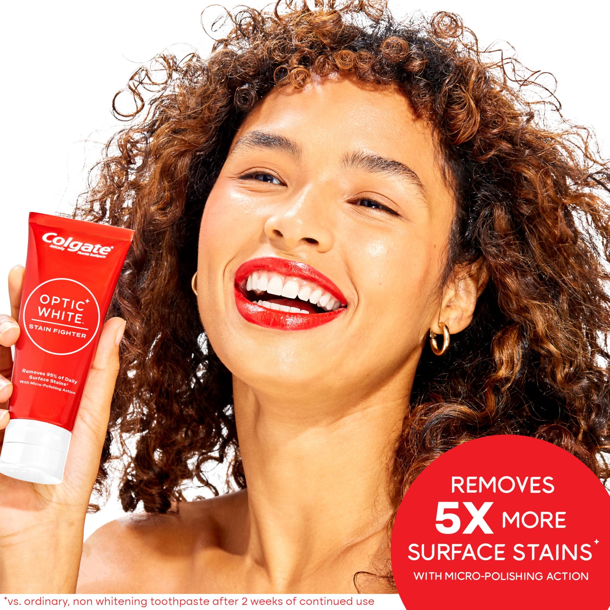 Details: Remove everyday surface stains for a brighter smile with the Colgate Optic White Stain Fighter Teeth Whitening Toothpaste. This teeth whitening toothpaste for adults removes 95% of daily surface stains for a brighter smile.* Get ready to reveal a smile that’s ready to shine with the Colgate Optic White Whitening Stain Removal Toothpaste. The Colgate Optic White Stain Fighter Whitening Toothpaste uses a patented whitening formula to remove 95% of daily surface stains*. Using micro-polishing action, this anticavity toothpaste removes 5X more surface stains.** Plus, this fluoride toothpaste comes in a refreshing Clean Mint Paste flavor so you can enjoy minty freshness every time you brush. Colgate Optic White Stain Fighter Teeth Whitening Toothpaste is a fluoride-based vegan toothpaste that is sugar free, gluten free, and enamel-safe for daily use. For whitening that works, choose the Colgate Optic White Stain Fighter Whitening Stain Removal Toothpaste. *after 2 weeks of twice daily use **vs. ordinary, non whitening toothpaste after 2 weeks of continued use