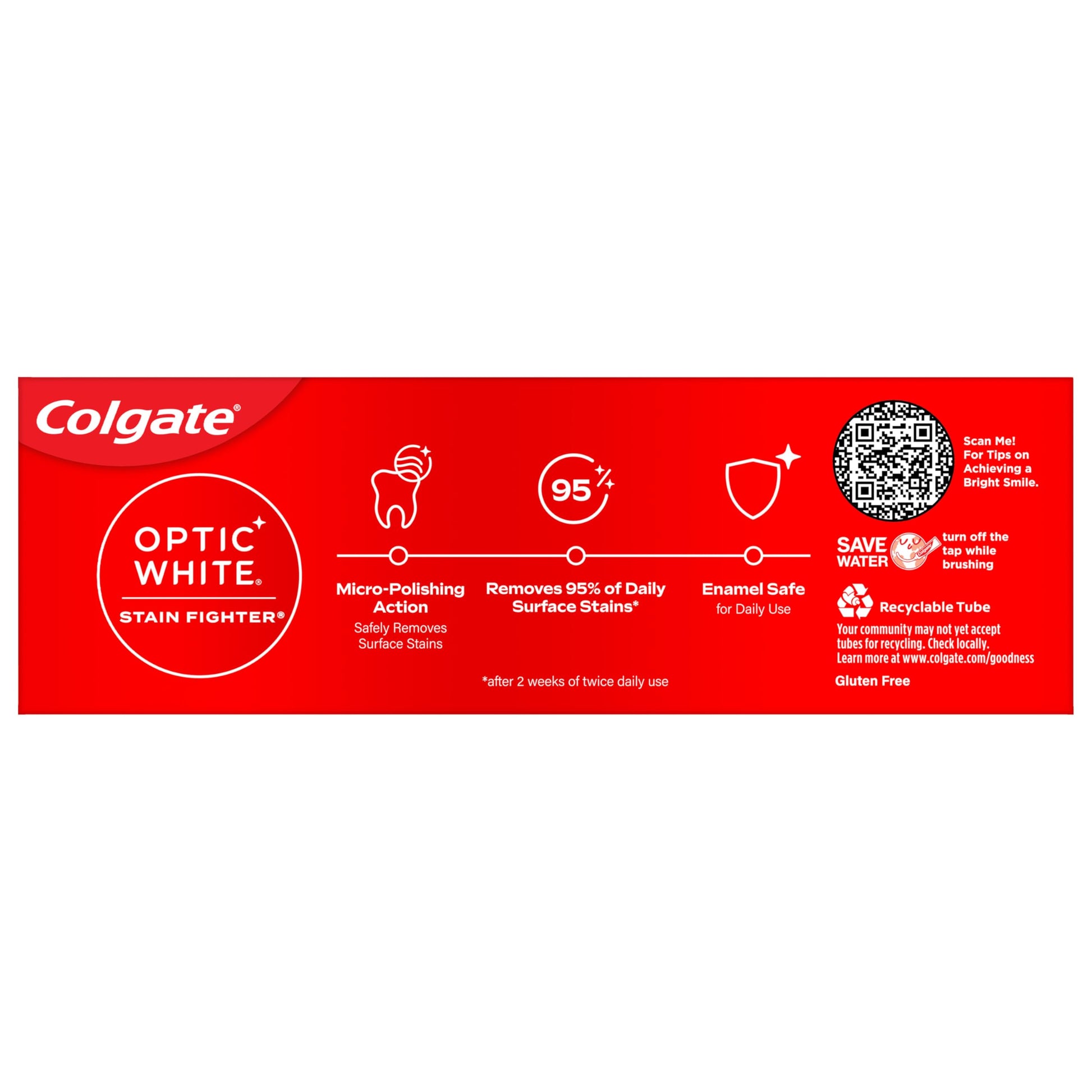 Details: Remove everyday surface stains for a brighter smile with the Colgate Optic White Stain Fighter Teeth Whitening Toothpaste. This teeth whitening toothpaste for adults removes 95% of daily surface stains for a brighter smile.* Get ready to reveal a smile that’s ready to shine with the Colgate Optic White Whitening Stain Removal Toothpaste. The Colgate Optic White Stain Fighter Whitening Toothpaste uses a patented whitening formula to remove 95% of daily surface stains*. Using micro-polishing action, this anticavity toothpaste removes 5X more surface stains.** Plus, this fluoride toothpaste comes in a refreshing Clean Mint Paste flavor so you can enjoy minty freshness every time you brush. Colgate Optic White Stain Fighter Teeth Whitening Toothpaste is a fluoride-based vegan toothpaste that is sugar free, gluten free, and enamel-safe for daily use. For whitening that works, choose the Colgate Optic White Stain Fighter Whitening Stain Removal Toothpaste. *after 2 weeks of twice daily use **vs. ordinary, non whitening toothpaste after 2 weeks of continued use