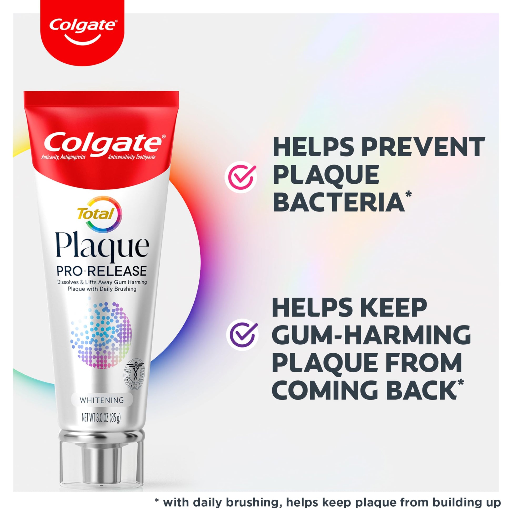 - One 3.0 oz. tube of Colgate Total Plaque Pro Release Whitening Toothpaste
