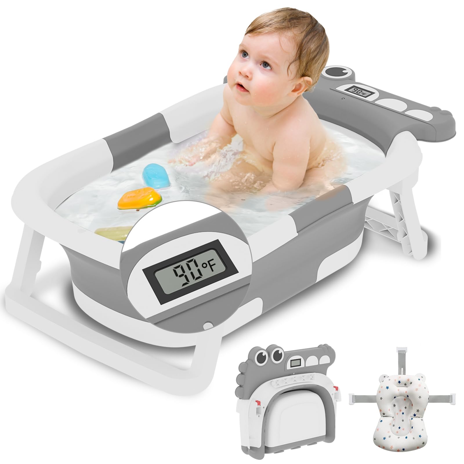 Collapsible Baby Bathtub, Baby Bath Tub with Soft Cushion & Thermometer, Alligator Baby Bathtub with Detachable Feet, Durable Infant Bathtub Applicable 0-24 Month, Gray
