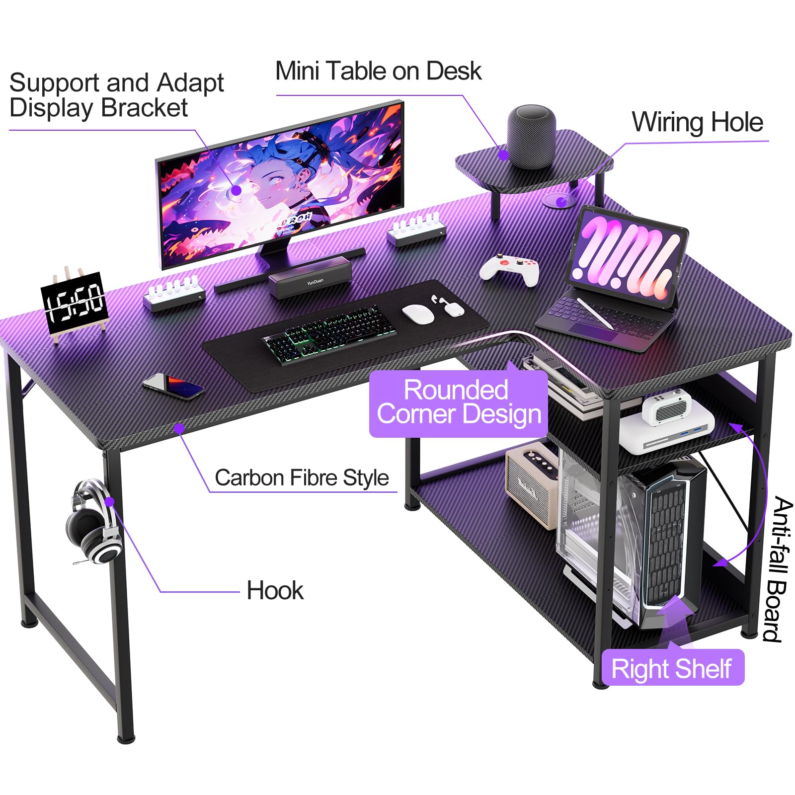- Luxurious Carbon Fiber Style: The gaming desk features a sleek, stylish design with a smooth surface that's gentle on the skin. Its practical design includes an outlet, adjustable shelf, monitor stand, cable hole, and a partition to keep your items from falling. The perfect combination of beauty and functionality, making it the ultimate choice for your workspace.