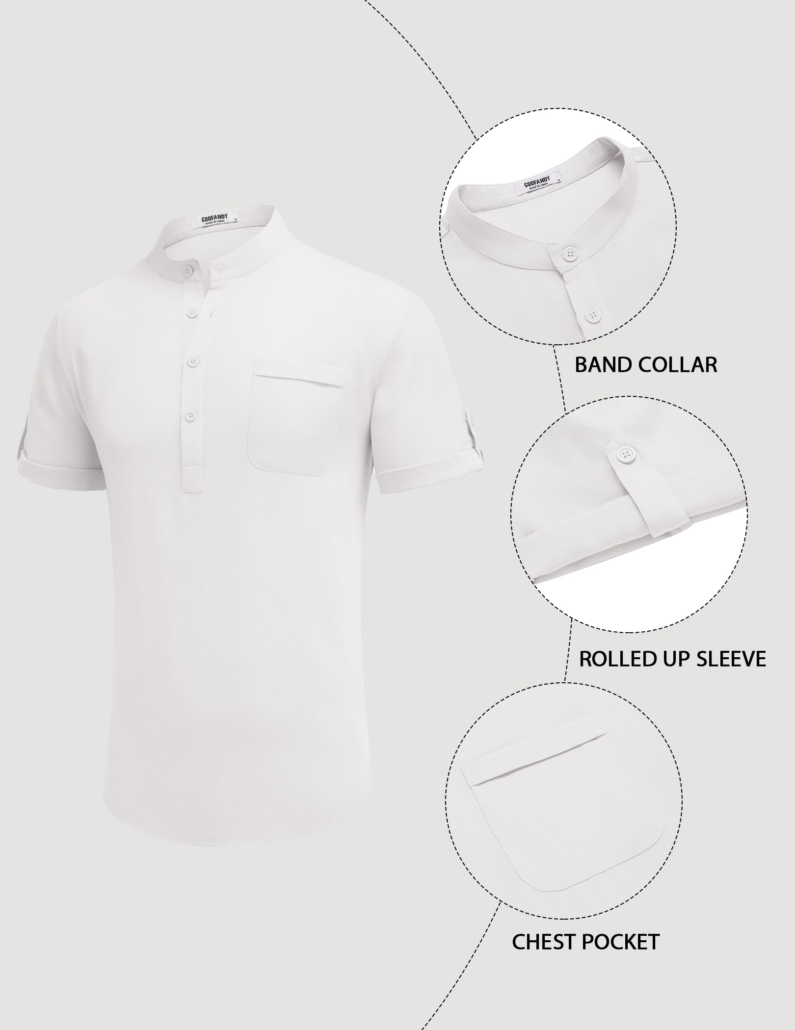 - 【Features】: Mens causal shirt features band collar, button-down closure and rounded hem. The casual henley shirts short sleeve design allows the sleeves to be rolled up or down, keeping you cool and relaxed, particularly enhancing your overall wearing experience.