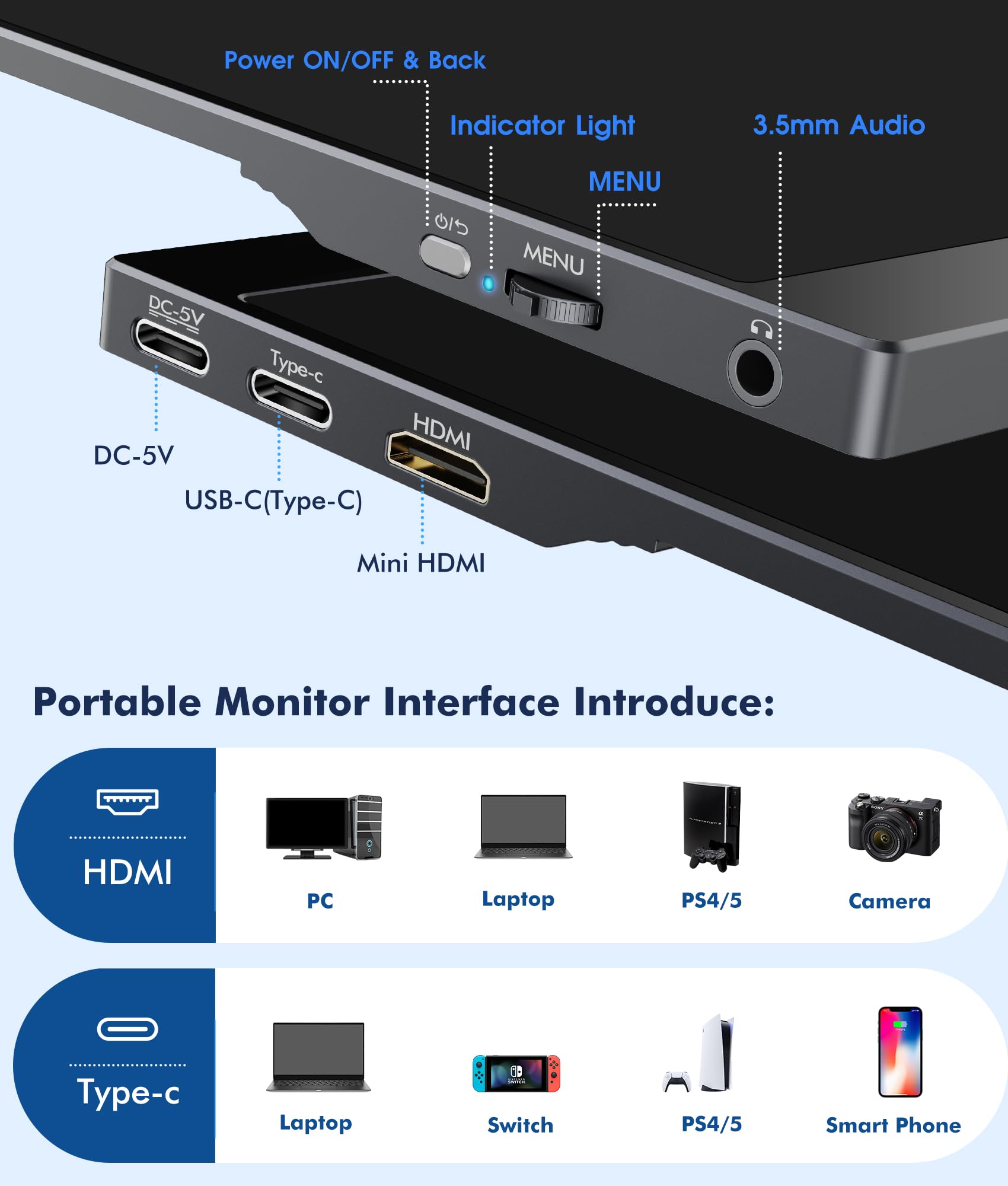 - ๐๐ข๐๐ ๐๐จ๐ฆ๐ฉ๐๐ญ๐ข๐๐ข๐ฅ๐ข๐ญ๐ฒ: Thanks to a USB Type C port and one mini HDMI port, this portable screen can be connected to a variety of devices such as PCs, laptops, phones, and gaming devices like Switch, Xbox, PS4, and so on. Please note that if your device's USB type C port is not USB 3.1 or Thunderbolt 3, then this USB C port will charge power ONLY without transmitting any signal.