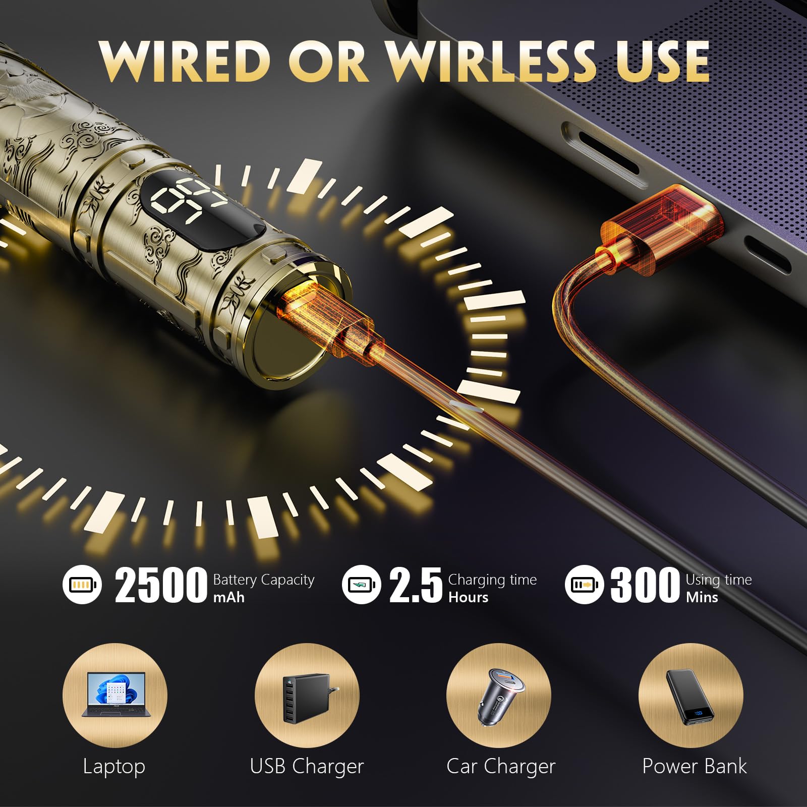 - Cordless hair clippers with built-in 2500 mAh rechargeable battery, It only takes 2.5 hours to fully charge with USB cable and provides up to 300 minutes of working time, Please fully charge it before using it for the first time (99 means full charge).You can use rechargeable battery, computer charger, car charger, to charge him, out of the use is also very convenient