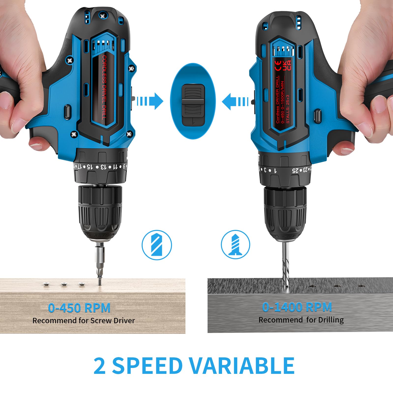 - 【JayLene Cordless Drill Set】Large 3/8"(10mm) keyless chuck can provide you superior bit retention,Equipped with 3-in-1 working mode, screw driving, drilling and impact drilling, this variable-speed (0-450RPM, 0-1500RPM) and 25+1+1+1 position drill is a powerful all-round helper for matching your desires, perfect for professional and DIYers.