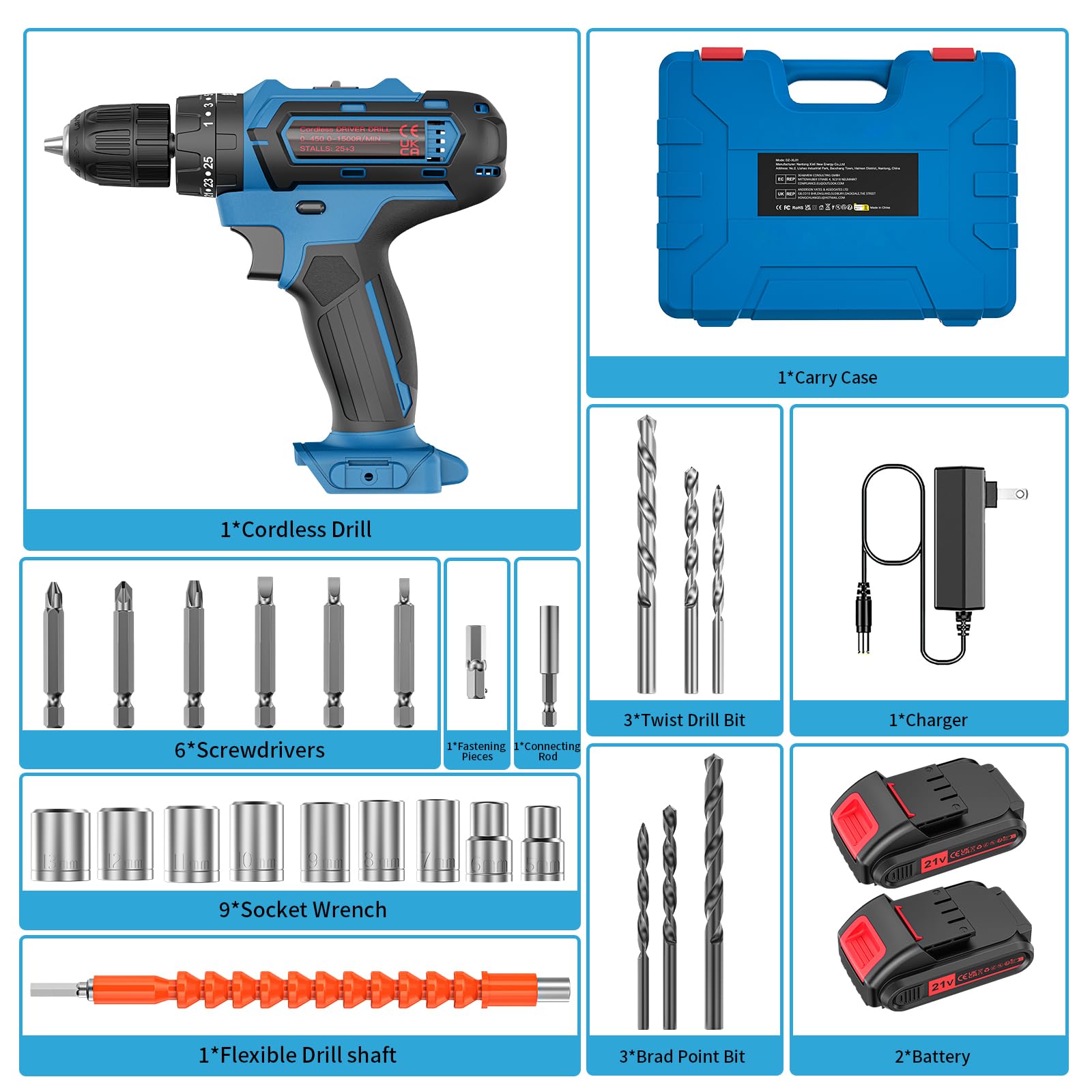 - 【Premium Accessories for your One-Stop Shopping 】Choose your JayLene drill driver set without worrying about purchasing any other accessories. Our tenet is providing you a one-stop source with convenience and saving you a lot of time and efforts. JayLene powers your way through tough tasks, and brings this drill kit to your door, including 6x Screwdriver Bits, 3x Twist Drill Bits, 3x Wood drill, 9x Socket Wrench, 1 Carrying Bag, 1 Flexible Shaft,2 21V Lithium-ion Battery and 1 Fast Charger.