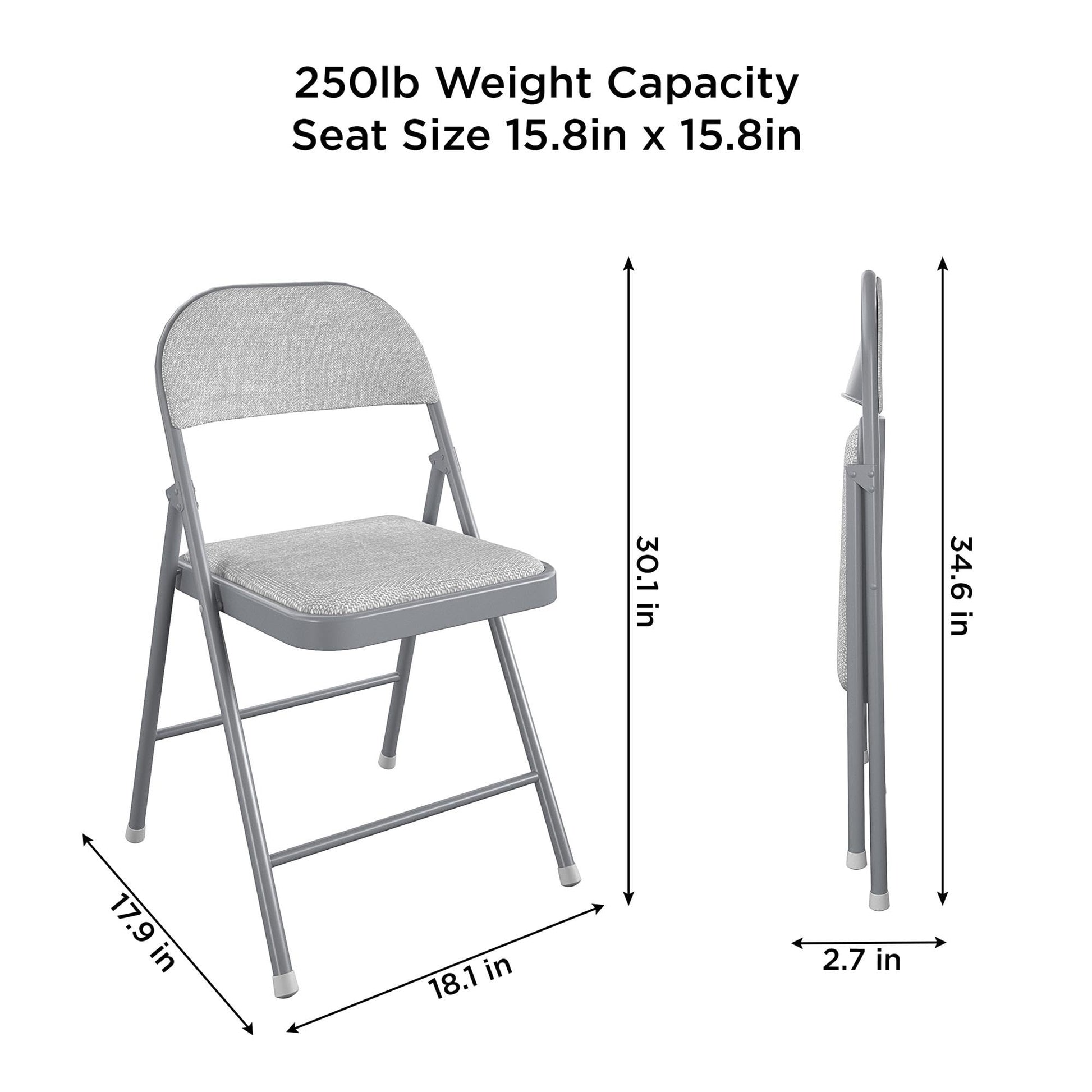 Details: COSCO has been a trusted solution for folding chairs and tables for over 80 years. COSCO’s SmartFold™ chairs were designed to maintain the classic size, quality, and comfort with the added benefit of a more compact fold. By reducing the folded height by 3.5 inches, the chair is easier to store, transport, and carry. Use the COSCO Fabric Folding Chair 4-pack at your next activity or get-together! The perfect seating solution for any gathering, this full-size chair is great for banquets, graduation celebrations, or everyday dining. The chair includes our standard protective non-marring, anti-skid foot caps that help prevent floors from getting scratched. Built to last, the gray fabric chair has two cross braces and is constructed of durable steel, allowing for a 250lbs. weight capacity.