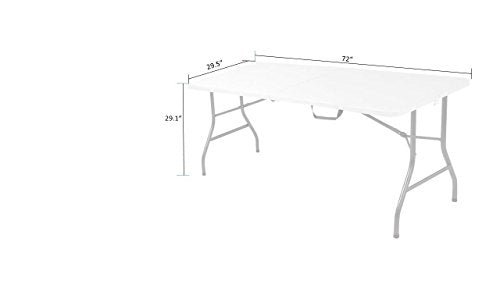 Details: COSCO Deluxe 6 foot Fold-in-Half Blow Molded Folding Table is the perfect table for any event! Molded from HDPE, a premium resin material that withstands all weather seasons. This makes the Cosco table suitable for indoor and outdoor use. This deluxe folding table folds in the center, locks closed, and features a comfort handle for easy transport and storage. Non-marring leg tips complete this table to ensure floors are not scratched or scrapped during use. The weight capacity of this product is 300 lbs.