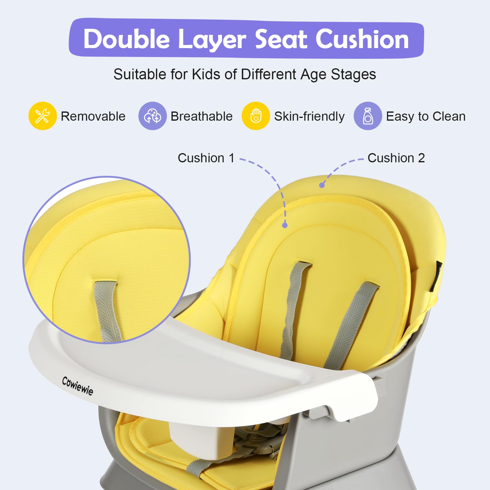 - COMFORTABLE SEATING: The removable tray can be adjusted in 3 positions to meet the needs of your growing child (for babies of all sizes). The included seat cushion is double-layered (the top layer is foam-padded for extra comfort) and can be used individually for different age groups.