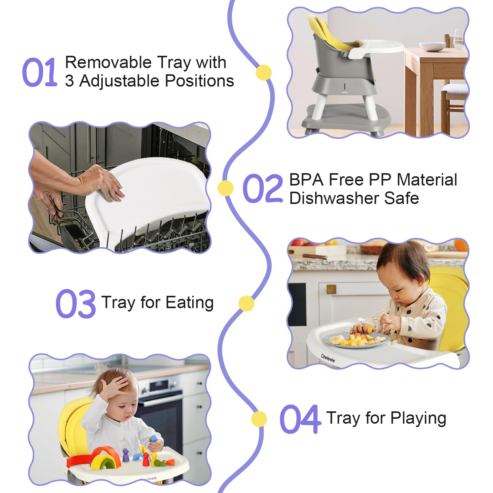 - 8 in 1 INFANT HIGH CHAIR: The Cowiewie Multi-Purpose High Chair easily converts into a variety of modes: full-size infant high chair, infant booster seat, small dining chair, toddler chair with upholstered cushion, universal children's chair, children's stool, children's table and chair set, block table and chairs (free block table mat) The table tops have a recessed surface and a smooth surface for different uses. Accompany your child as he or she grows!