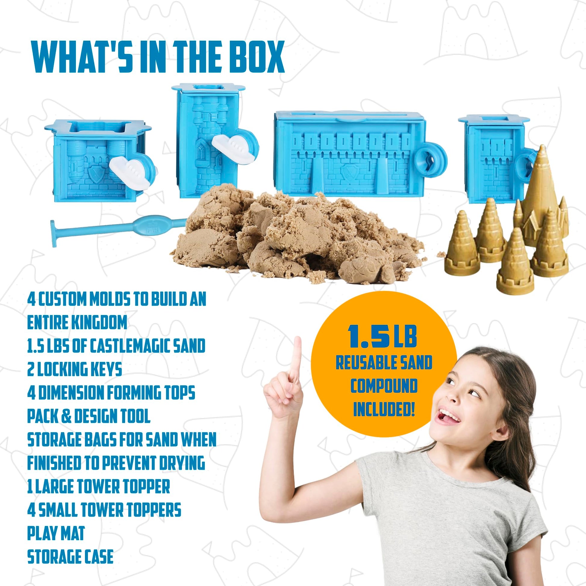 - Indoor Play Sand Kit: Easily craft sandcastle kingdoms on any indoor table with this Castle Magic Sand that feels like dough and holds its shape like clay; kit includes tools for tunnel making, tower toppers, detailed castle casts, and a playmat; for kids ages 6 and up
