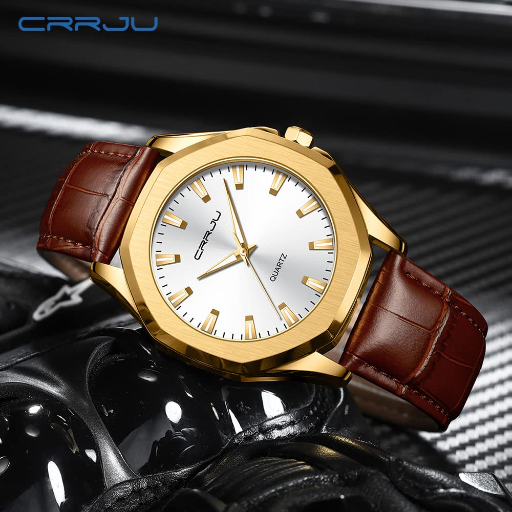 CRRJU Men's Golden Fashion Luxury Classical Leather Watches for Men Business Simple Luminous Analog Quartz Wristwatches