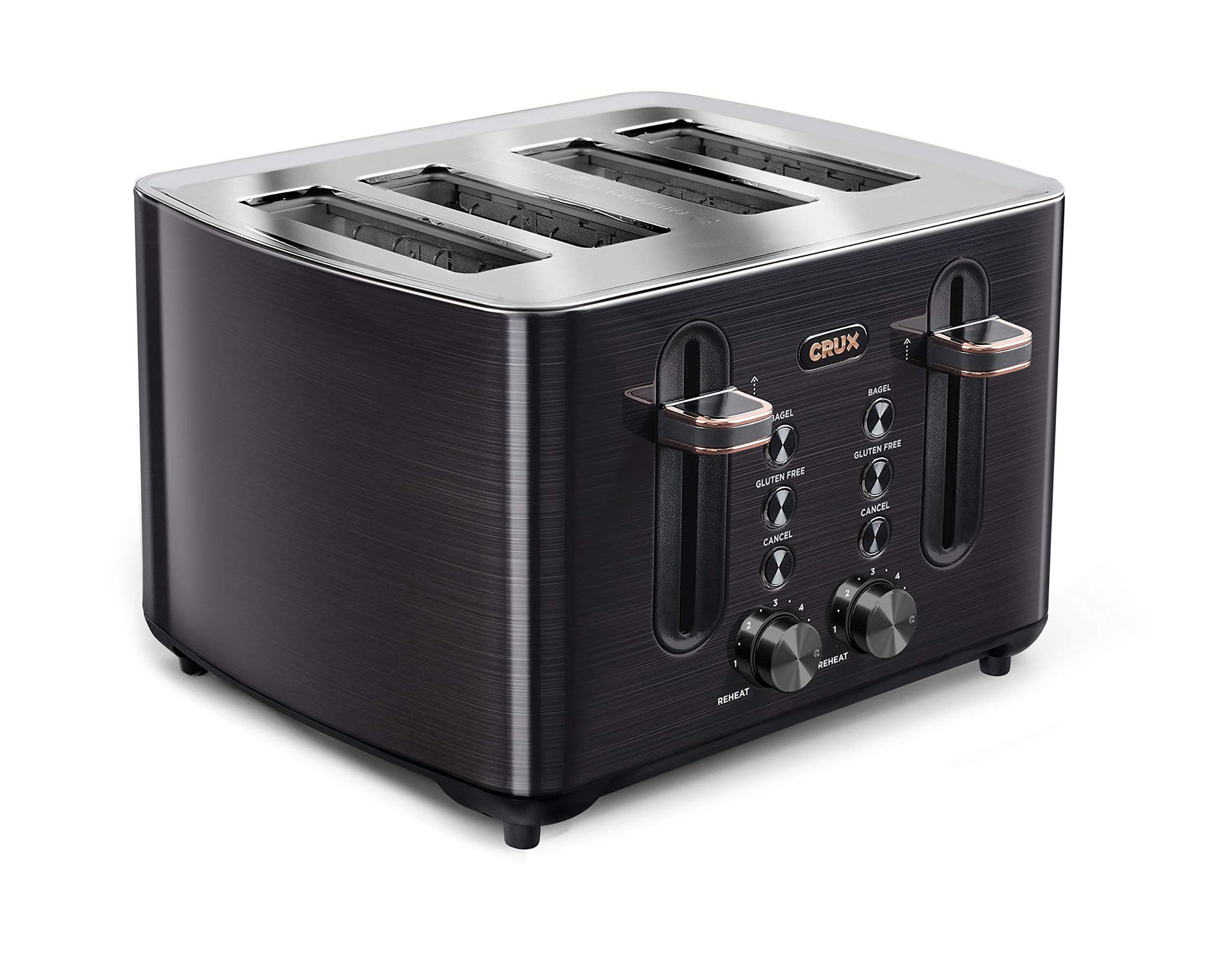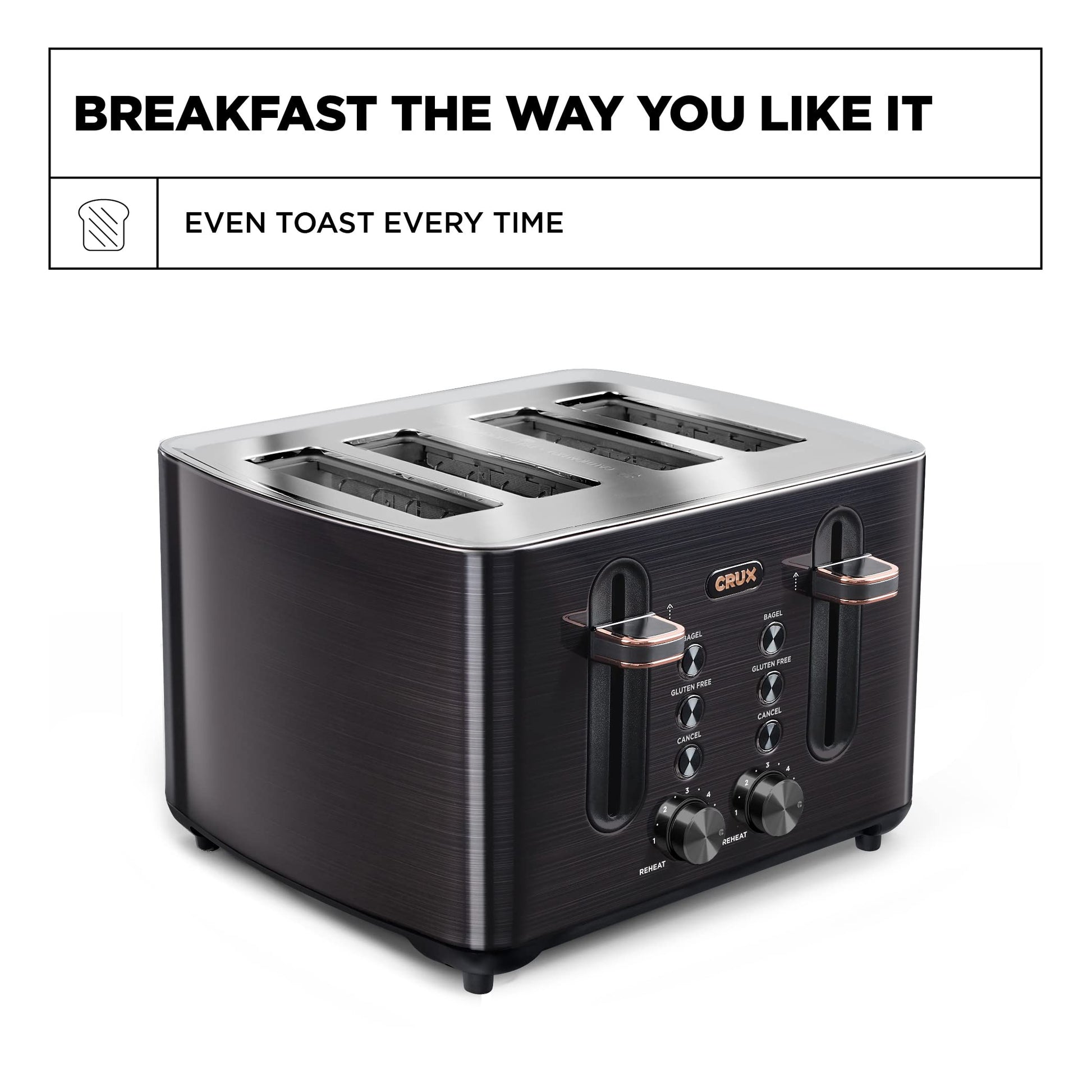 Details: The CRUX 4 Slice Toaster makes meal prep easy for family and friends. Utilize the six-setting shade control dial designed to create consistent and even browning, every time. Toast up to four slices of bread at a time and if they get cold, utilize the reheat feature for instant warming. Designed with extra wide slots, the CRUX 4 Slice Toaster can accommodate standard sliced bread, bagels and thick baguettes. Gluten free? A newly developed feature provides the ideal cooking environment for your favorite breads. Often denser in quality, gluten free breads require a longer cooking time. The gluten free feature adjusts and adds the ideal amount of time to your toasting cycle, accommodating all your gluten free needs. We’ve added white LED lights to indicate when your toast is ready, high lifting levers to easily remove your toast, and anti jam and auto shut off features for your safety. The CRUX 4 Slice Toaster is sleek, easy to clean, and gets the job done every time. Toasting as it should be: simple, straightforward, and perfectly browned.