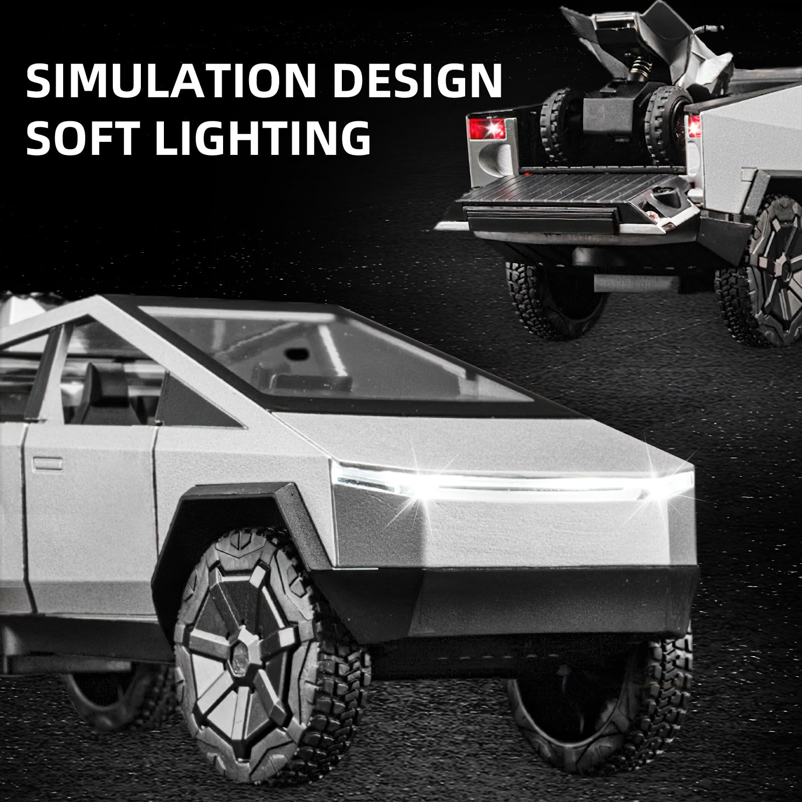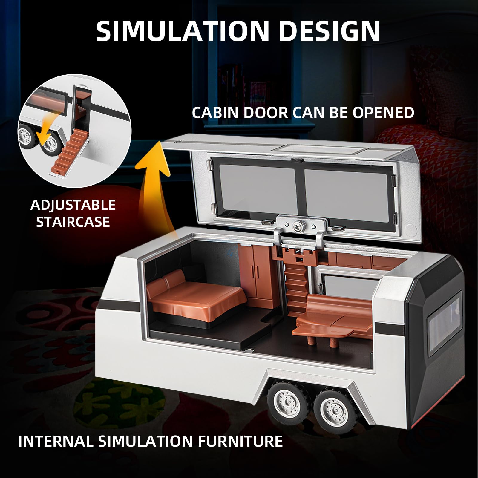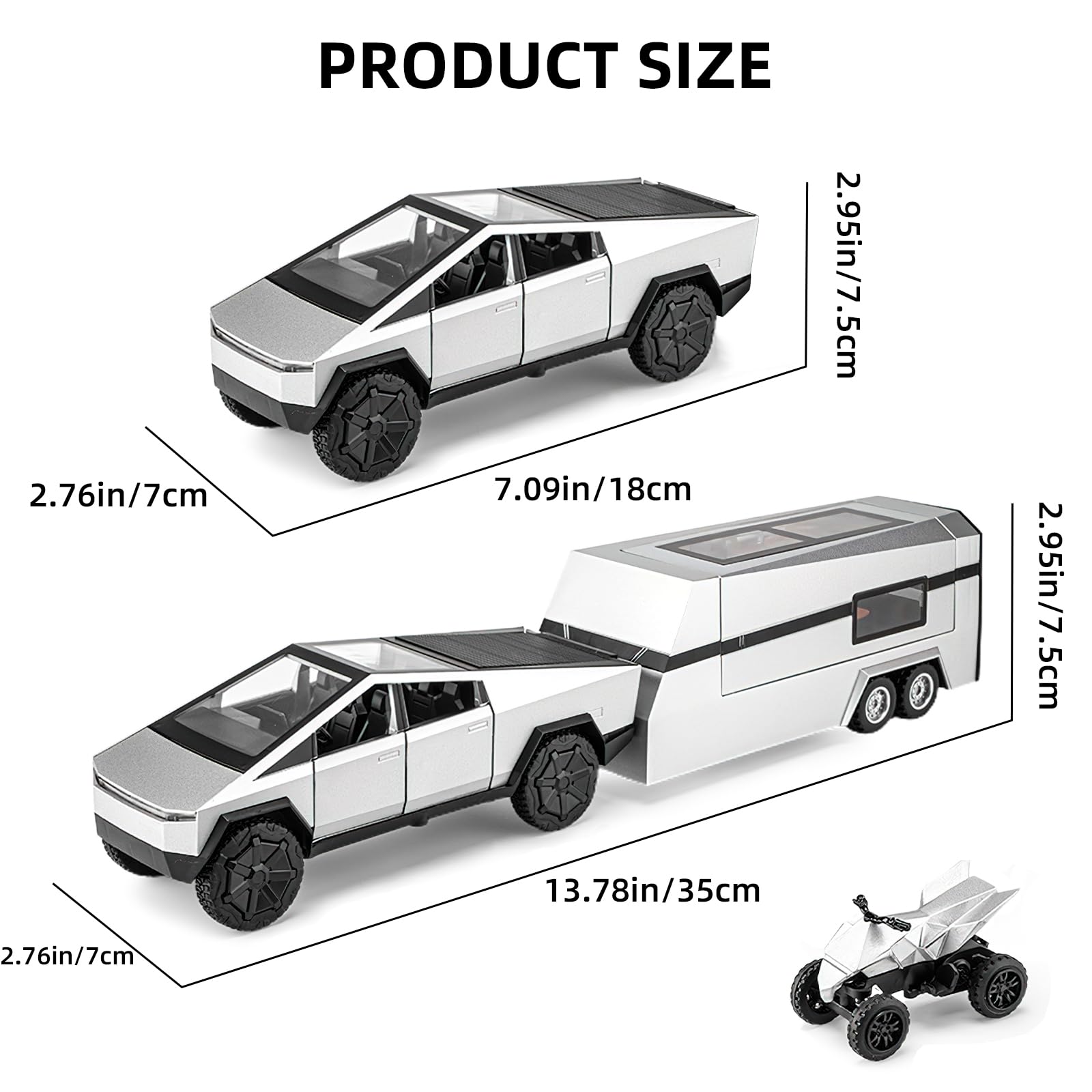 - 1/32 Cybertruck model measures 7.0”X 2.75" X2.8"(Trailer RV measures 8.26"X 2.79"X 2.87"). net weight: 1.lb