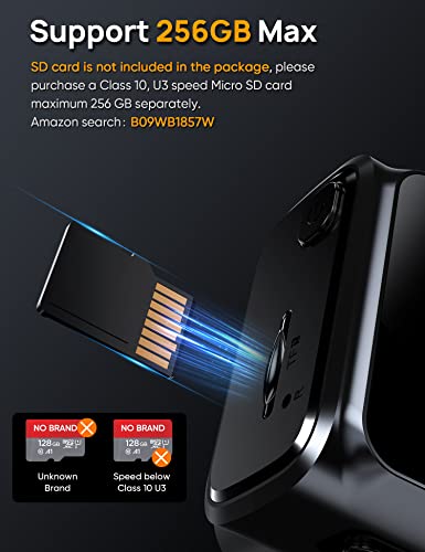 - 【Support 256GB Max & Heat Resistant】 The working temperature is from -4℉ to 167℉ (-20℃ to 75℃). With a high heat resistance chipset and adhesive pad, the dash camera can work fine and stay attached to the windshield even in the hot sun. Supports up to 256GB microSD cards. The SAMSUNG microSD card (ASIN: B09WB1857W, not included) is recommended.