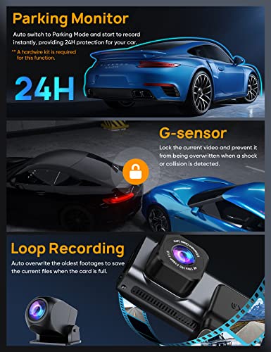 - 【24 Hours Parking Guard】To achieve this function, an extra car accessory- hardwire kit is required (ASIN: B0B4W6S9FV, not included in the package). A2 Pro dashcams for cars will enter parking mode after your car is off. You can set the parking mode as your preference- motion detection: auto start recording when detecting a motion; Time-Lapse Recording keeps recording continuously with low power consumption and low frame rate. Provides around-the-clock protection to your cars.