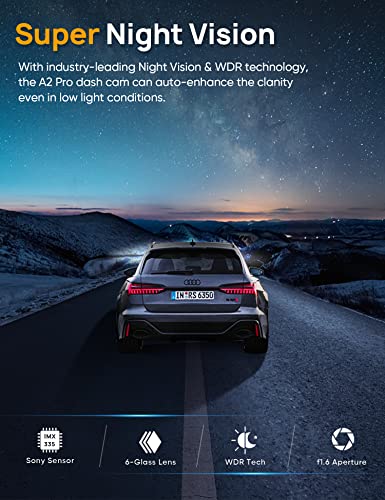 - 【Loop recording & Gravity Sensor】The A2 Pro dash cam will automatically overwrite the oldest videos with the latest videos when the insert memory disk reaches its max storage to achieve seamless loop recording; for the videos when the G-Sensor is triggered (most unusual collisions will trigger the built-in 3 axis gravity sensor), they become unable to be deleted, save them as evidence in case you need.