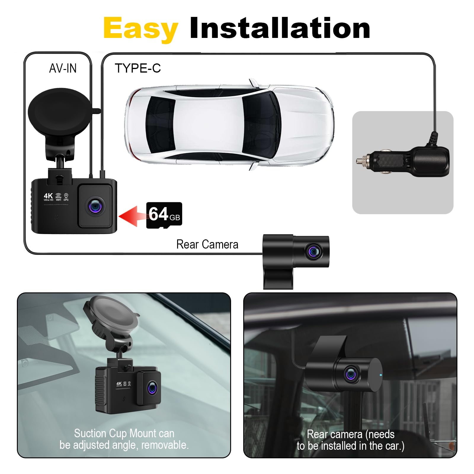 - Compact & Easy to Install: The front and rear dash cam features a sleek, compact design that simplifies installation. Its small size allows for discreet mounting behind your rearview mirror, ensuring an unobstructed view while driving for a seamless and comfortable experience. With a 2.0" IPS screen, the dash cam provides sharp, clear visuals, allowing you to effortlessly navigate settings and view recordings.