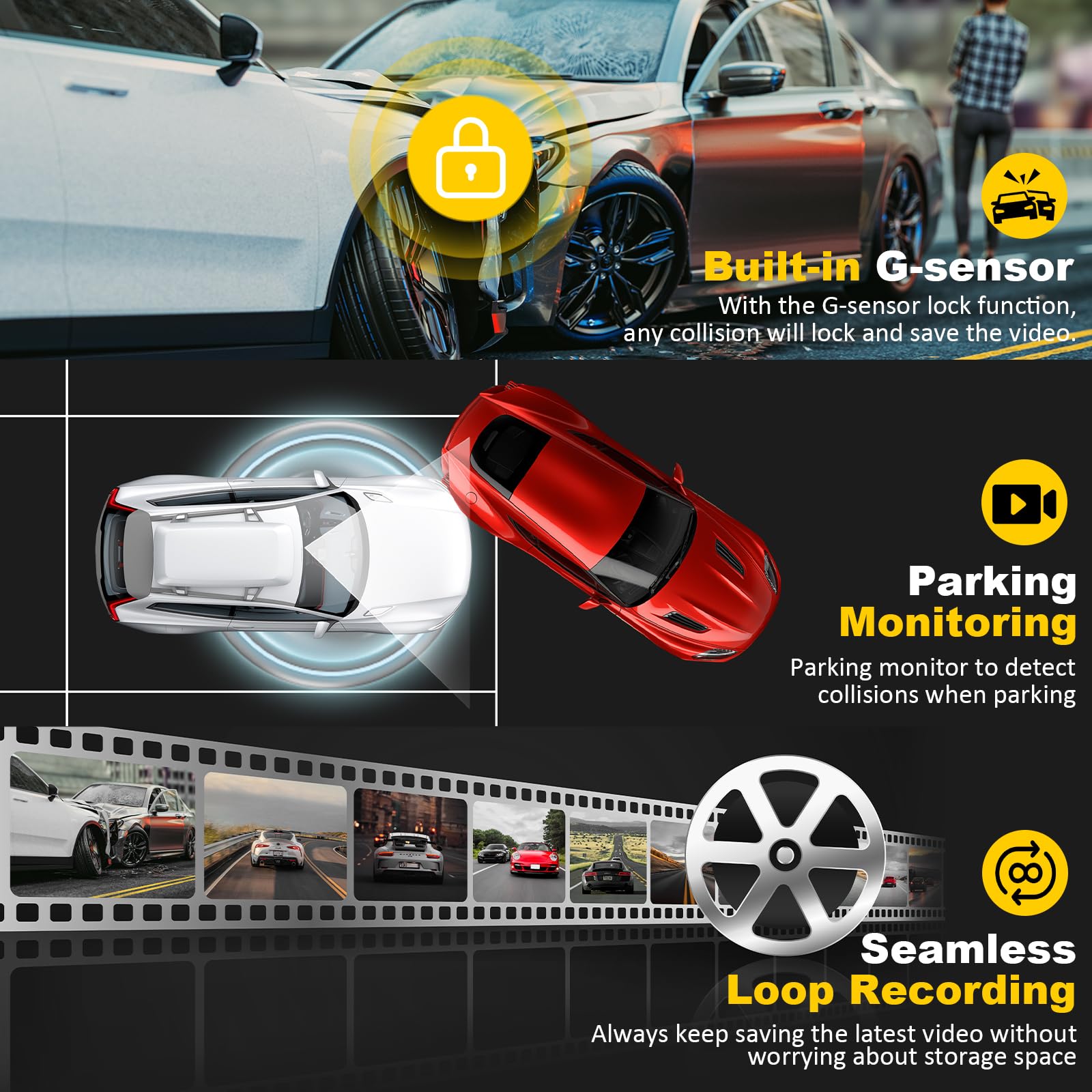 - Built-In G-Sensor:The 4K dash cam is equipped with a high-performance G-sensor, designed to detect collisions or abrupt events, and optimized to detect even minor impacts. When the G-sensor detects an impact, the dash cam automatically locks the relevant footage, ensuring that critical recordings are not overwritten during loop recording. This feature provides reliable protection by preserving essential video evidence in the event of an accident, making it an essential safeguard for driving.