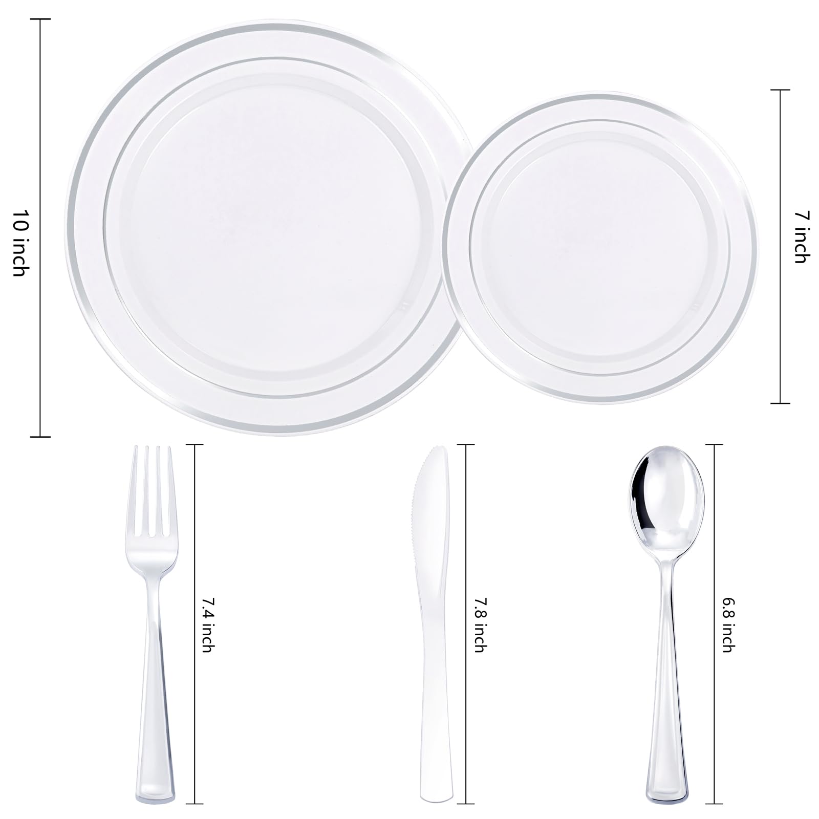 - PERFECT DIMENSIONS - Seamlessly fitting into every occasion, this exceptional party plate set is the perfect choice. This package includes 100 dinner plates measuring 10 inches, 100 salad plates at 7 inches, 100 silver Knives, 100 silver Forks, 100 silver Spoons.