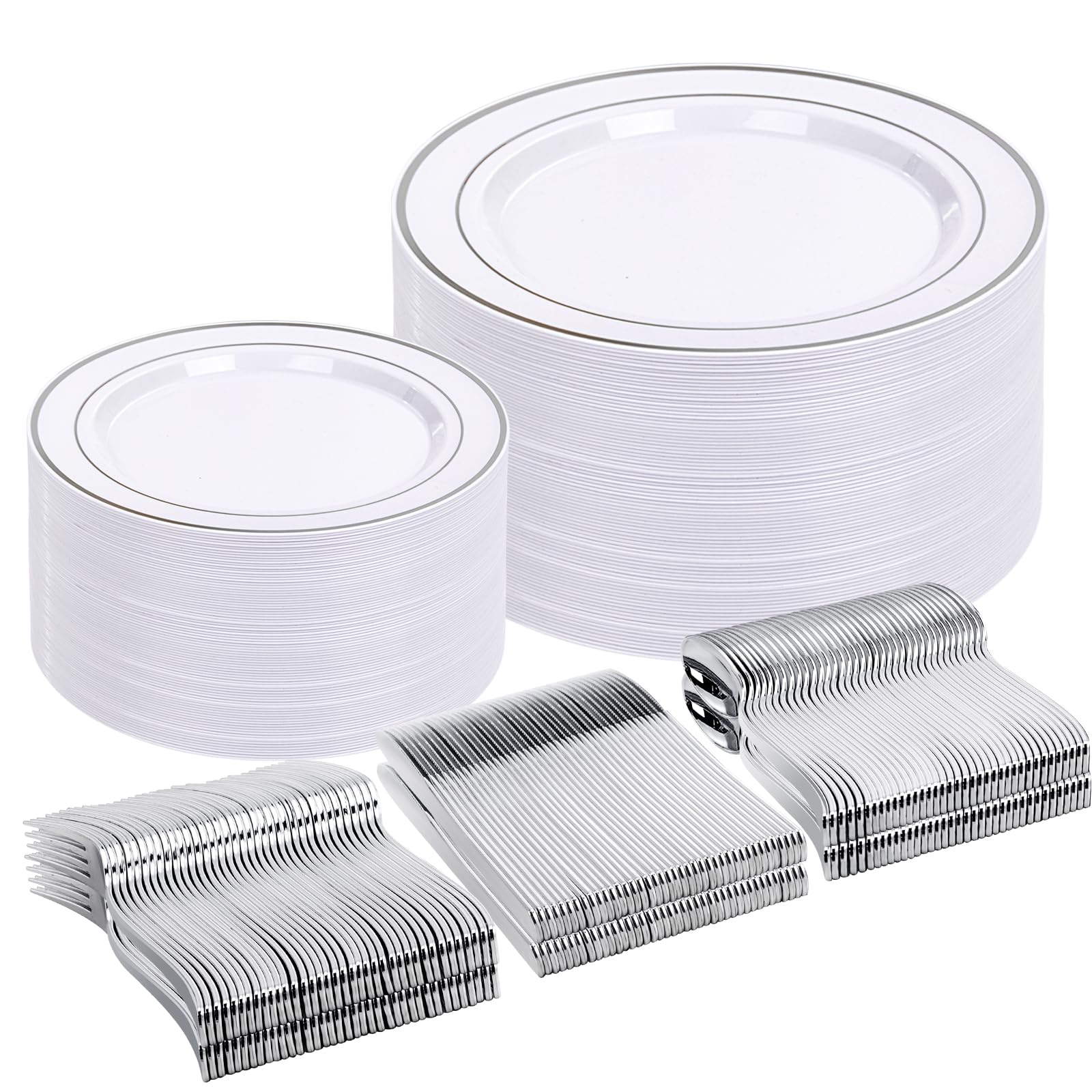 - ELEGANT DESIGN - With classic white plates adorned with timeless silver rims, these disposable plates and silver silverware sets effortlessly integrate into any event, resembling authentic ceramic plates. They exude a classic, timeless aura that helps create cherished memories for guests.