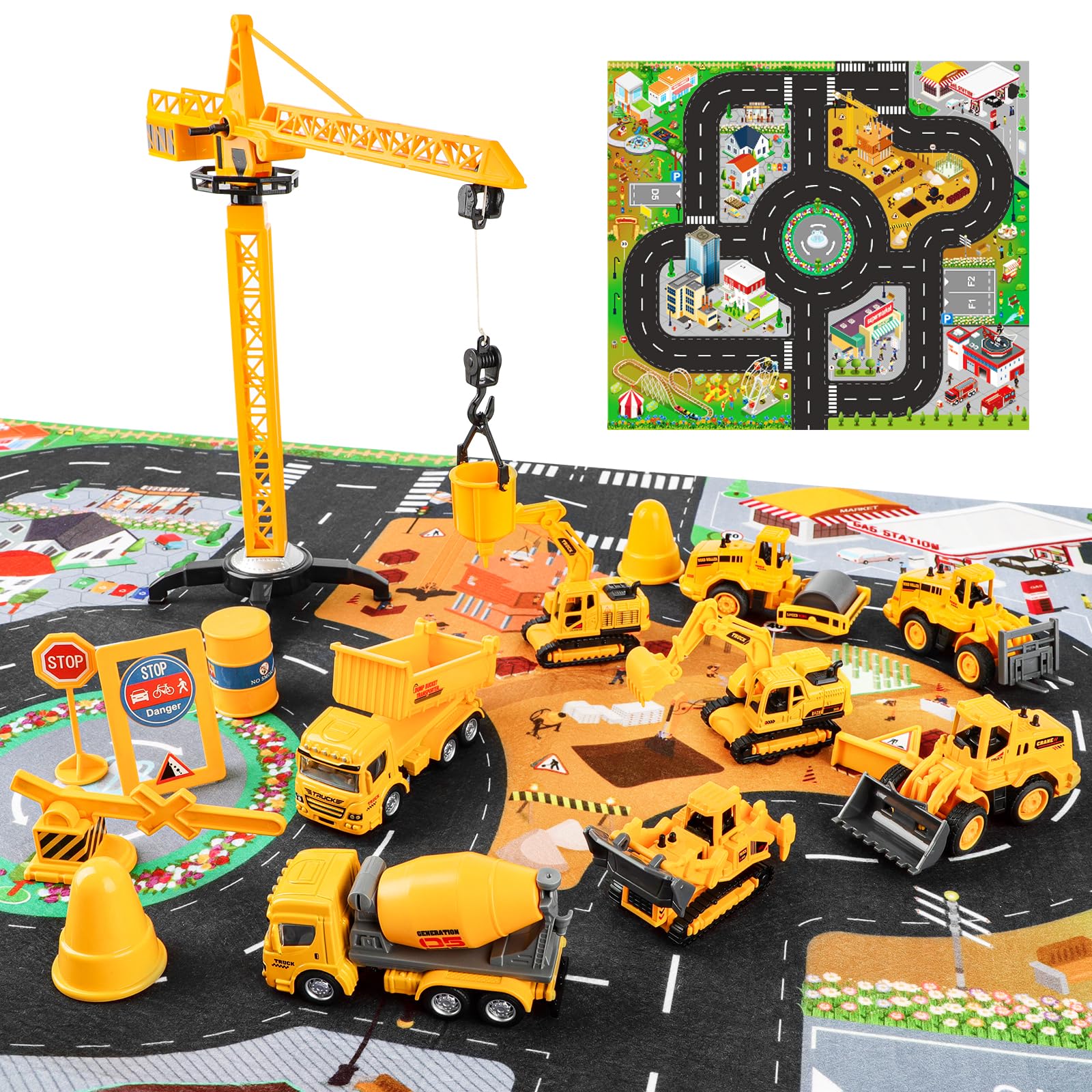 - 【Complete Set Construction Trucks Toys】deAO construction truck play set comes with 8 mini die cast engineer cars, 7 simulated road signs, 1 Crane, and a construction site playmat. Your little engineer will find hours of fun with imaginary and creative play on his own construction site.