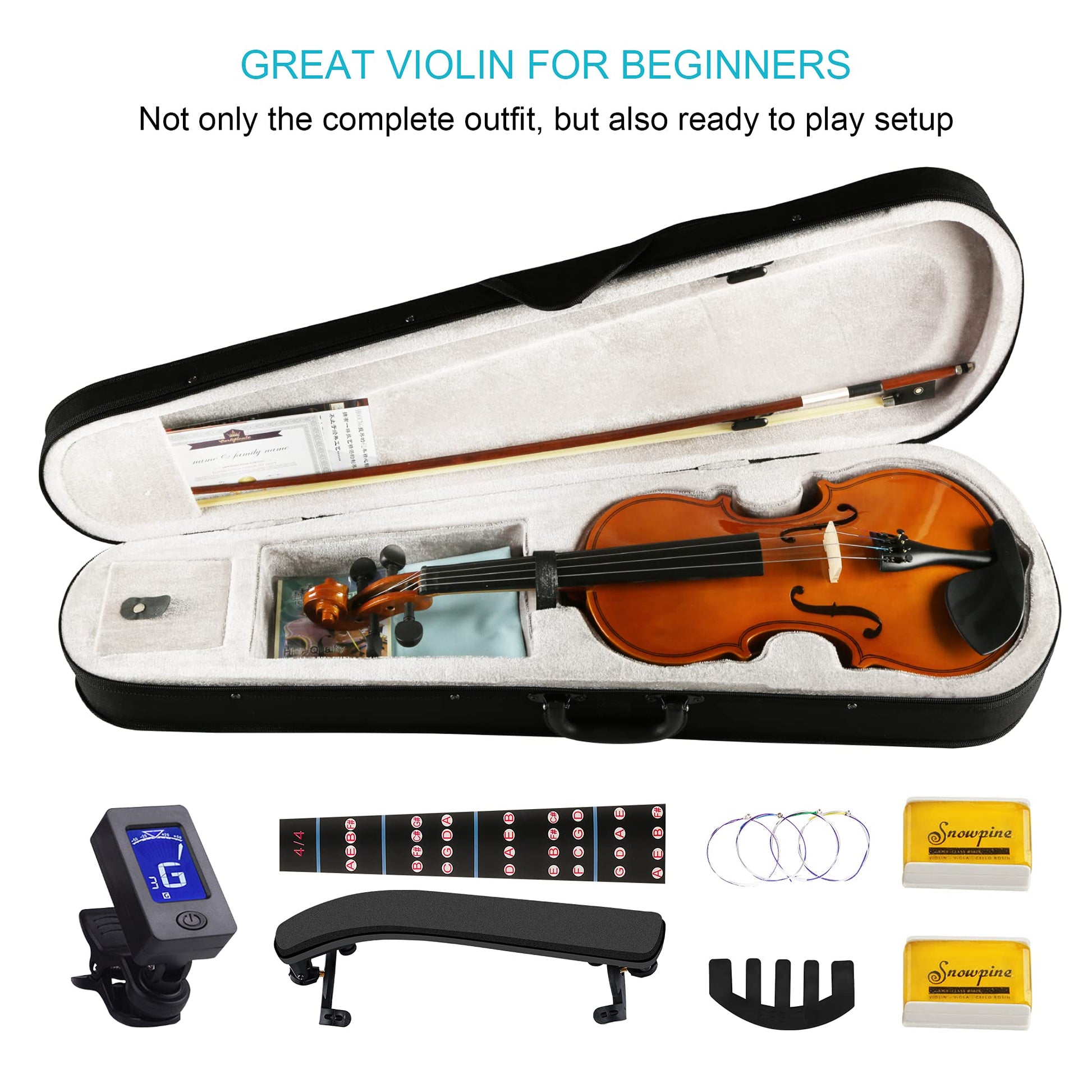 - [GREAT VIOLIN FOR BEGINNERS] This violin was designed for both Kids and Adults violin beginners, not only the complete outfit but also the ready-to-play setup. It has included necessities to get your practice started. Therefore, you just need to be patient to wait for the coming of package.