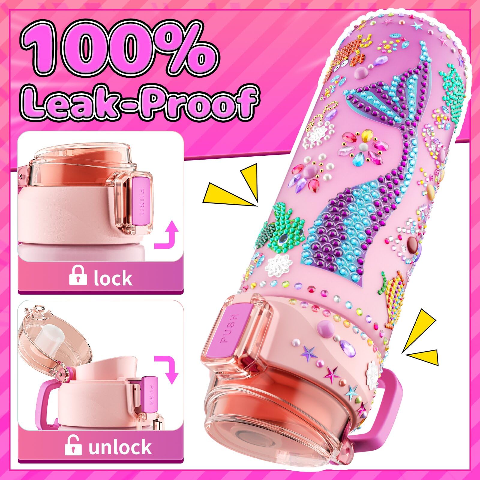 - Easily Open & Leakproof: Our DIY mermaid water bottle flip-top lid is designed with a secure lock, which effectively preventing dust. The wide mouth is easy to clean and add fruit or ice cubes! The school water bottle features a food-grade silicone ring inside, provides 360° leak-proof protection. The diamond decorations water bottle with time marker can motivate kids stay hydrated all day