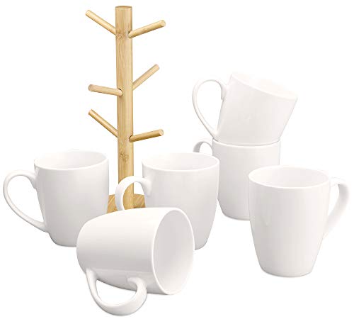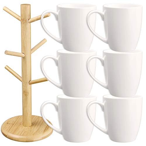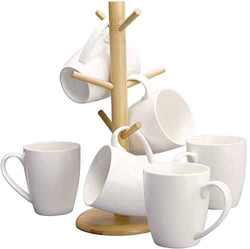 - MUG TREE HOLDER SET: Start your day the right way! This coffee cup holder set helps keep your mugs and coffee cups organized. It includes 6 white ceramic (16 oz.) mugs and a wooden tree stand for hanging or display.