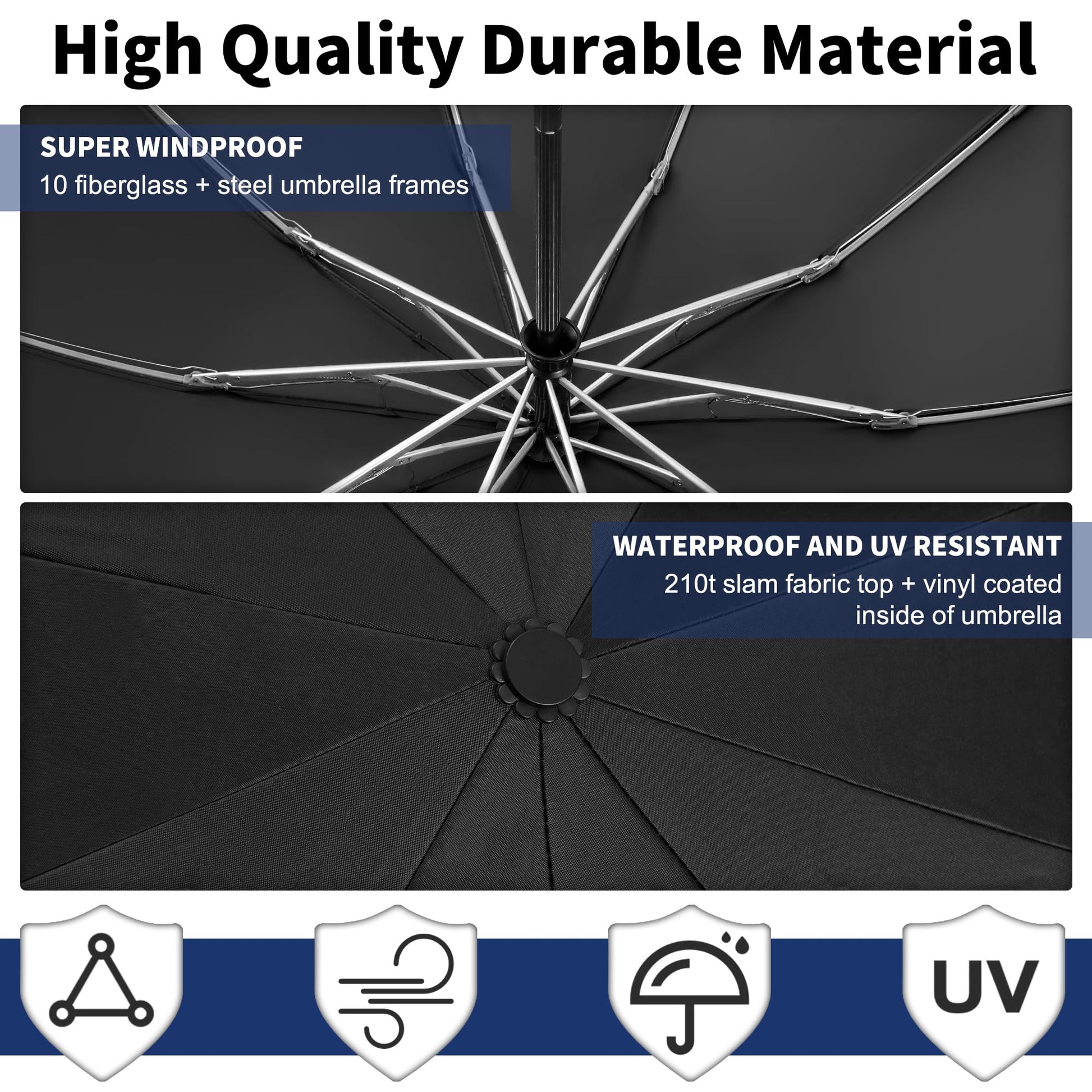 - Windproof Umbrella. Made of 10 sturdy fiberglass ribs and steel umbrella frames so that can withstand strong gusts without flipping inside out