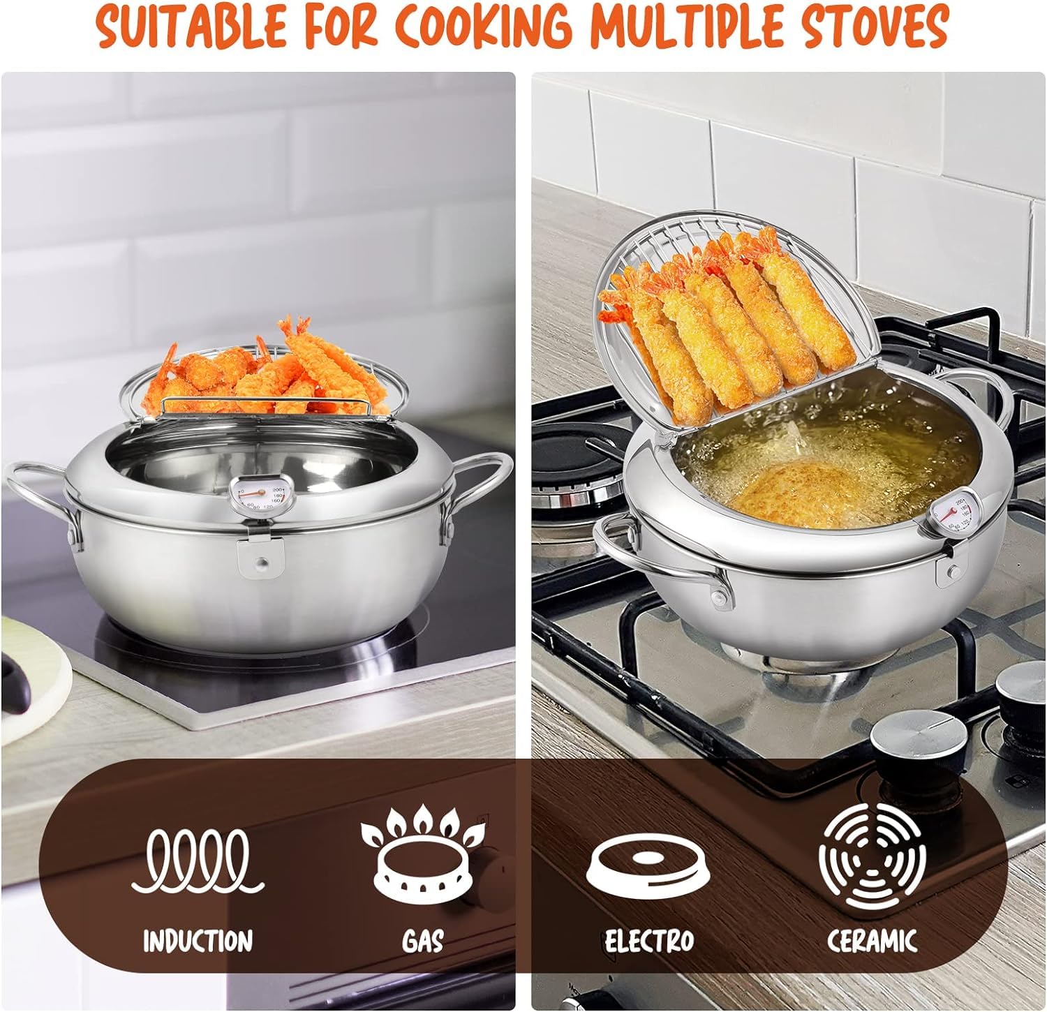 - Wide Application: The tempura stainless steel fryer is compatible with all types of fire sources, including gas stove, induction stove, electric stove fire source. Add a new partner to your kitchen and you will find it worth it.As a Perfect Gift for Your Lover, Mother, Girlfriend and so on.