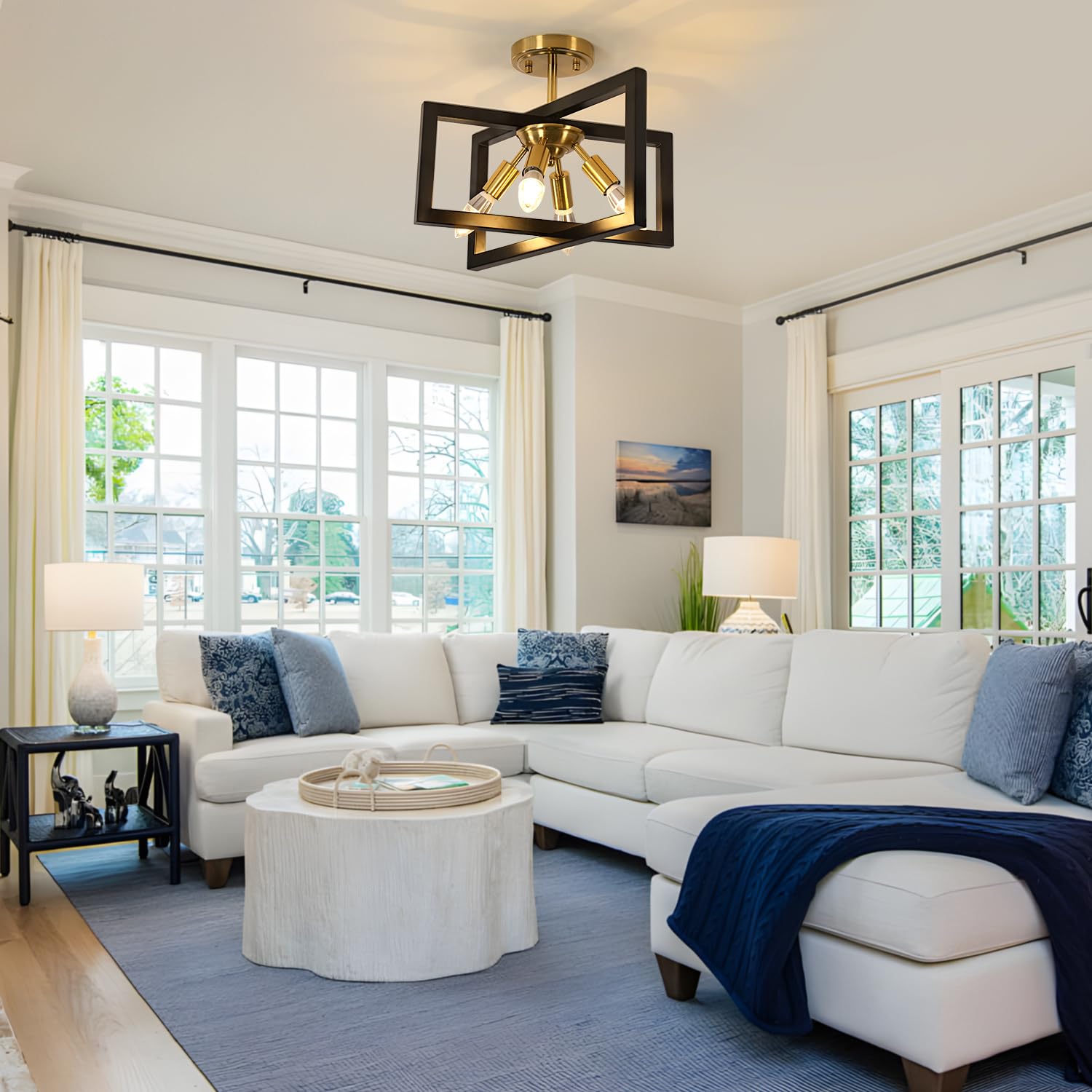 DELIPOP Semi Flush Mount Ceiling Light, 4-Light Gold Farmhouse Industrial Ceiling Light Fixtures with Black Square Metal Frame Close to Ceiling Light for Kitchen, Dining Room, Living Room, Bedroom