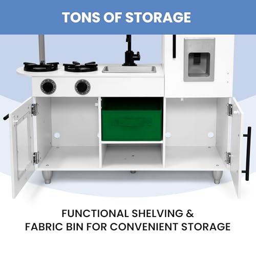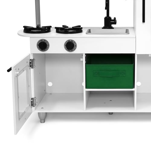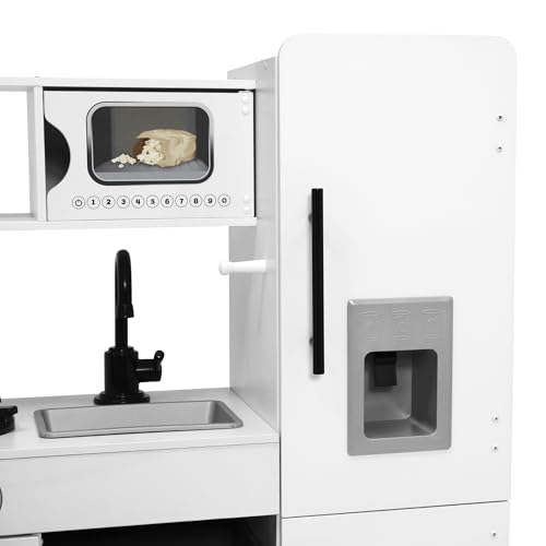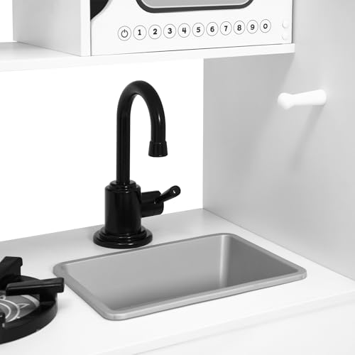 - MODERN DESIGN: This play kitchen features a modern sink faucet and sleek black hardware | Large format provides room for multiple children to play | Crafted of premium and sustainable materials for a durable toy that can be passed down from kid to kid