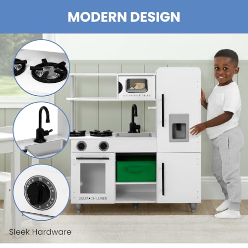 Delta Children Deluxe Modern Kitchen - Toy Kitchen Playset with Realistic Knobs That Turn/Click, Oven, Sink and Fridge/Freezer with Ice Maker, White