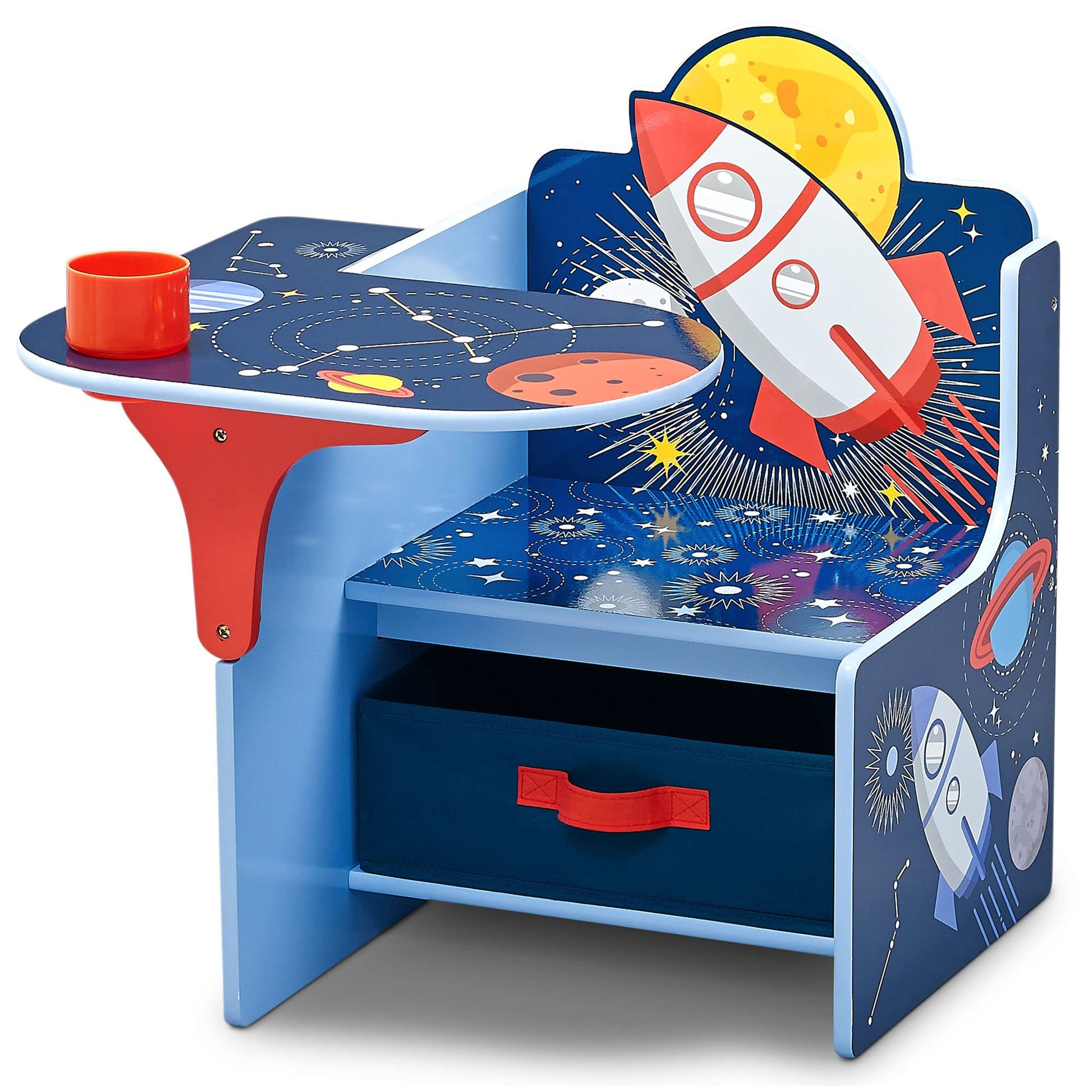 Details: With this Space Adventures Chair Desk with Storage Bin by Delta Children in your orbit, you’ll have the most stellar playroom in the entire universe! The perfect spot for snack time, crafts, playtime or homework, this smart and sturdy chair and desk combo with colorful graphics of planets, stars and rocket ships also features a built-in cup holder and a fabric bin underneath for additional storage. Perfectly sized, this durable chair and desk has a large work surface and low height that makes it easy for preschool kids and toddlers to get in and out on their own. Pair the Space Adventures Chair Desk with Storage Bin with other items in Delta Children’s Space Adventures collection for a galaxy-themed bedroom.