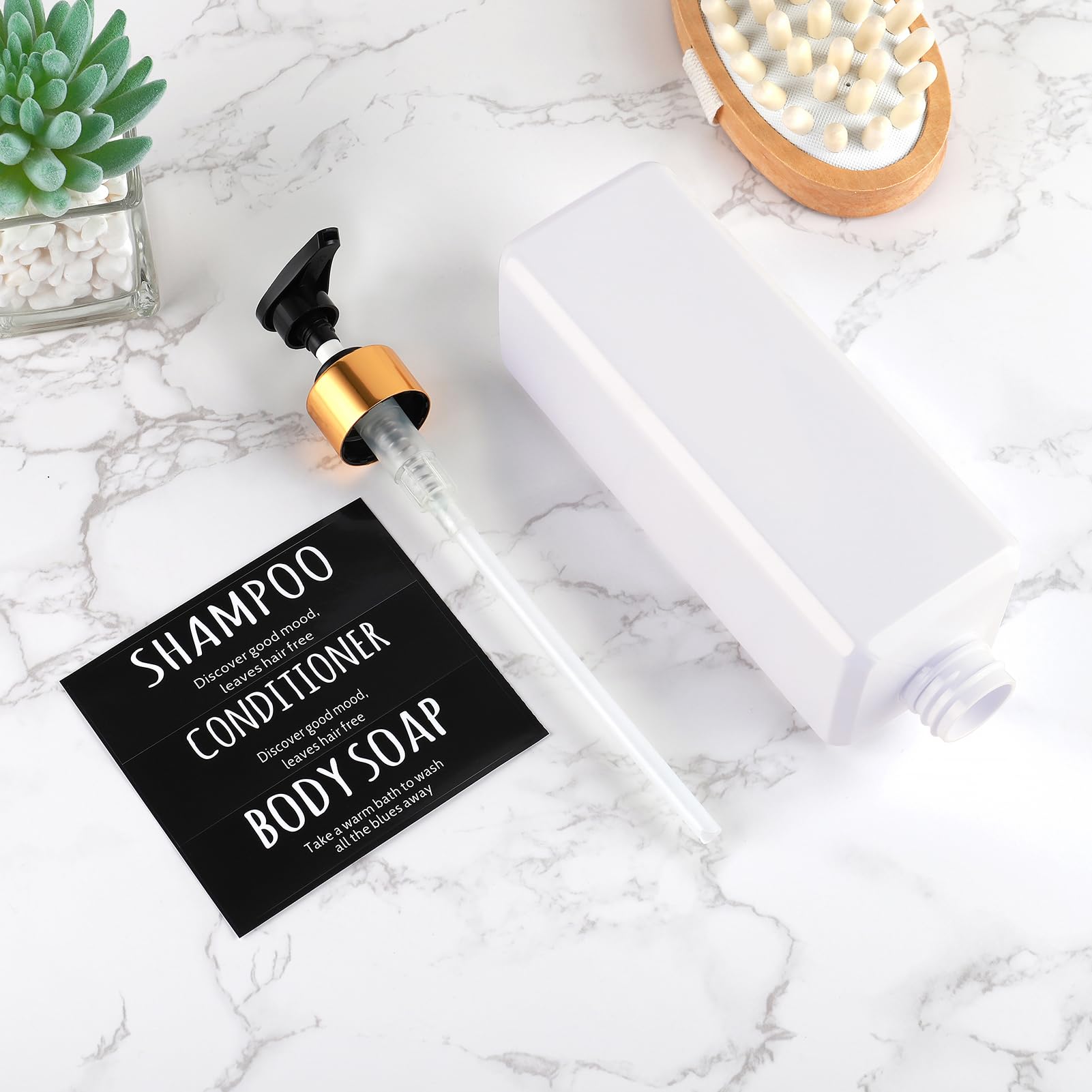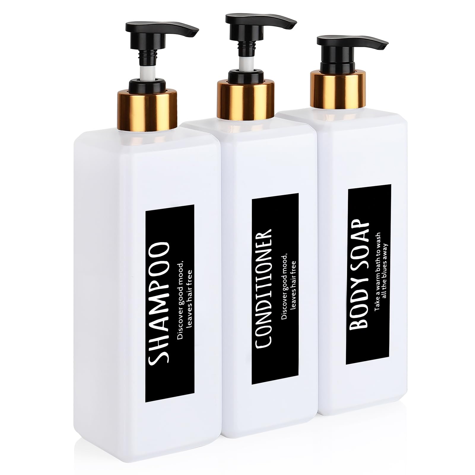 - UPDATE Premium Quality - Newly upgraded bottles with strengthened thickness and stiffen body, High quality Golden pump head, perfect collocation full of senior sense. These shampoo and conditioner dispenser refillable plastic bottles are made of BPA-free reinforced PET material, which is durable and doesn't worry about fragility.