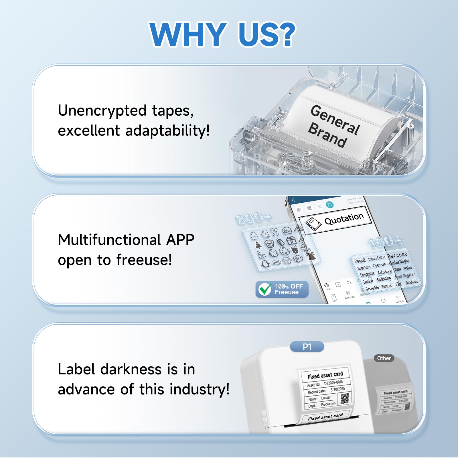 - Save Money: Unencrypted Labels. DETONGER P1 sticker machine can adapt to various kinds of label paper,customer no need to spend extra money on expensive encrypted labels to use our labeler