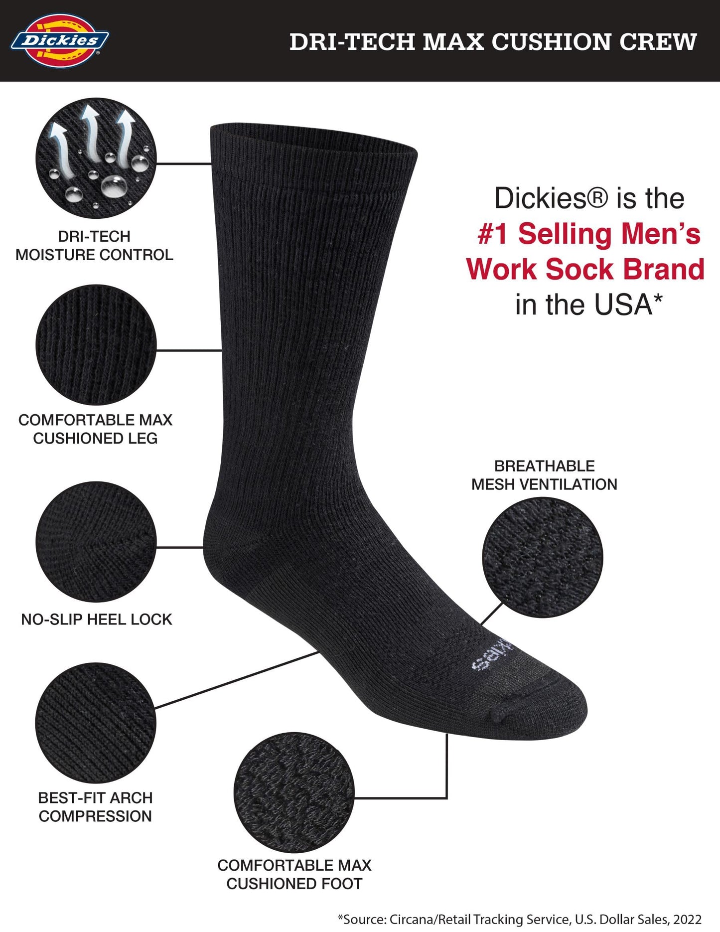 Dickies Men's Dri-Tech Max Cushion Crew Socks-performance outdoor Moisture Control crew Socks Multipack with wicking, moisture management fibers keep feet dry, ventilation channels engineered for air circulation and moisture control, arch compression hugs feet and keeps socks in place, while providing in-step support, Reciprocated heel and toe for superior fit and comfort. For Over 100 Years Dickies has been making hard-duty work products built to stand up to whatever life throws at you. Dickies Work Socks are built with purpose to deliver superior comfort and performance on and off the job.