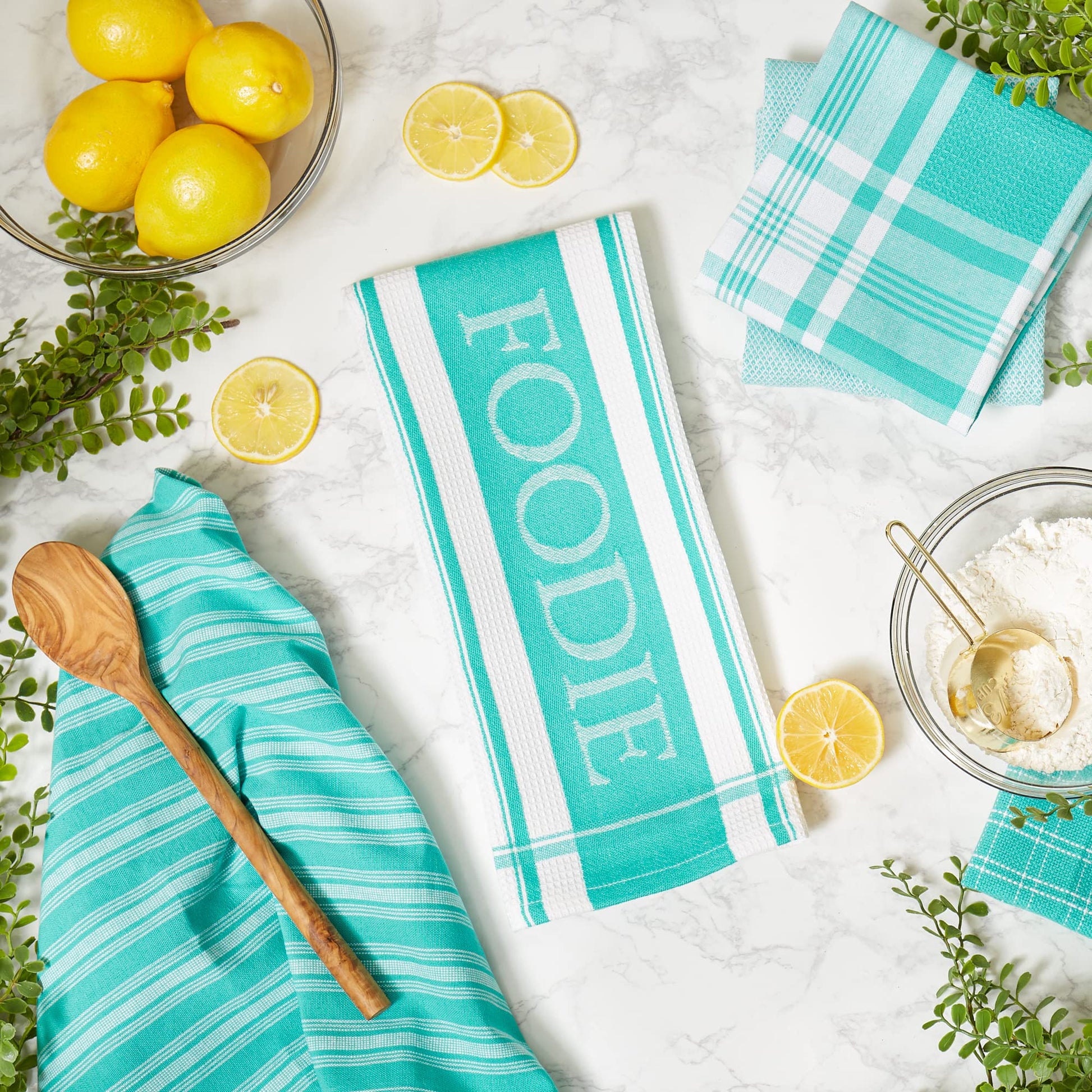 - A DISH TOWEL SET TO TACKLE KITCHEN MESS - Each set includes 4 dishtowels that measure 18 x 28" and 1 dishcloth that measures 13 x 13"; easily handles all of your drying and cleaning kitchen tasks