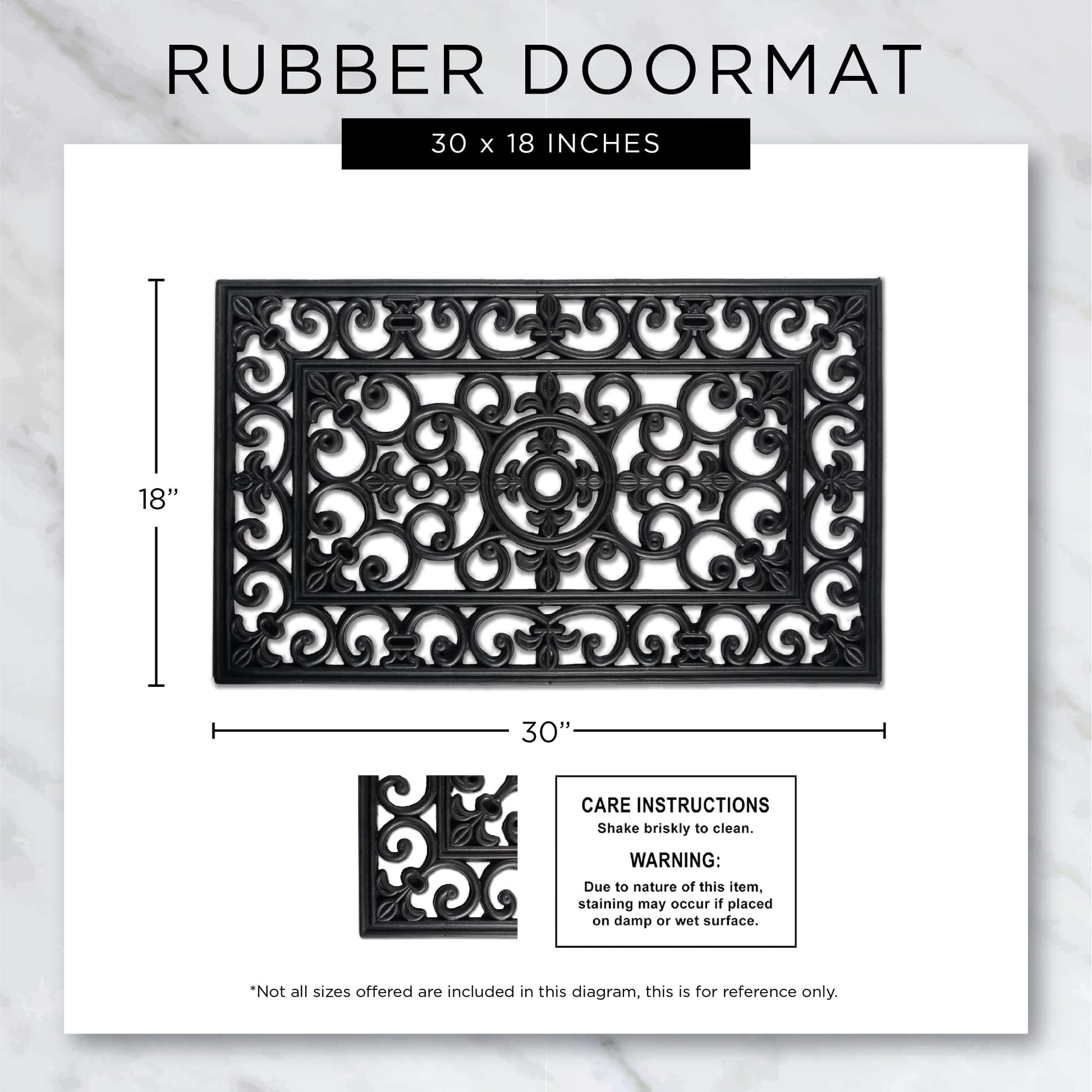- 100% RECYCLED RUBBER: Measures 18x30x.04" and weighs 4.4 lbs; To clean, shake briskly or rinse with hose as needed; Staining may occur if placed on a wet or damp surface