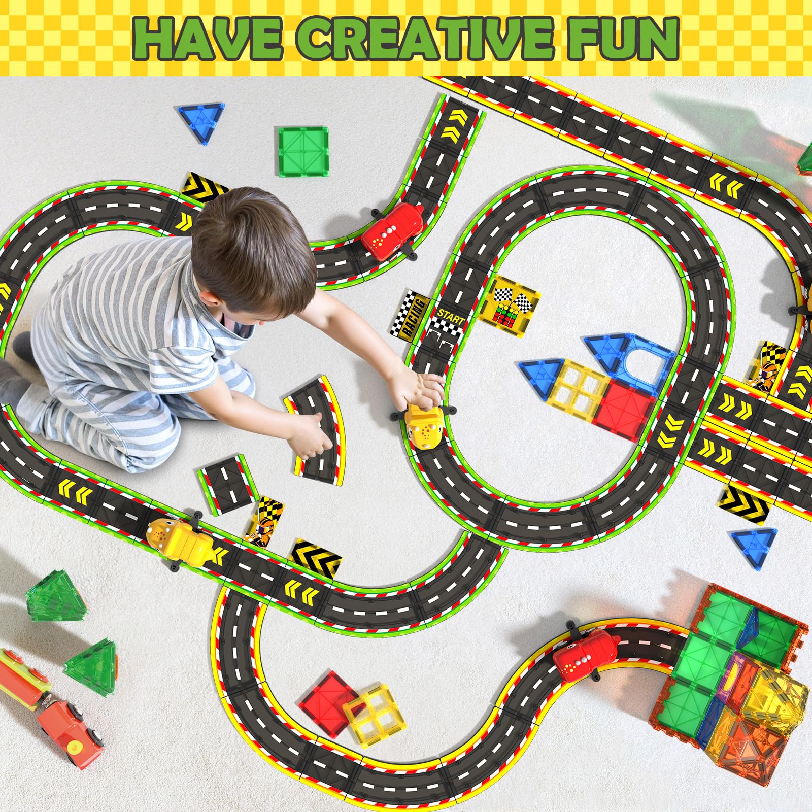 - DINOSAUR RACING ADVENTURE: Step into a world of high-speed thrills with our double-sided Magnetic Tiles Race Tracks! Build an epic racetrack with curves, warning strips, and start and finish lines, then watch as two dinosaur cars come to life—switching from roaring dinosaur cars to sleek racers zooming around your tracks! An exciting dinosaur race full of speed and creativity is about to begin. Ready, set, race