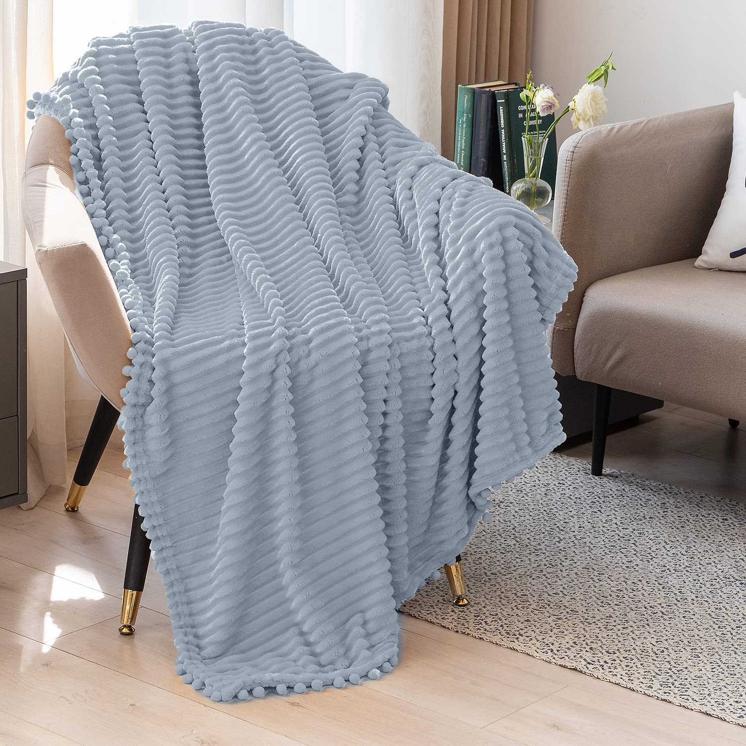 - 【Pompom & Strip Design】- Flannel fabric with pompoms fringe around the blanket, different color and white stripe pattern with 3D touching offers you amazing senses of softness. The fabulous color revives this blanket with an elegant appearance to complement your room a chic feeling.