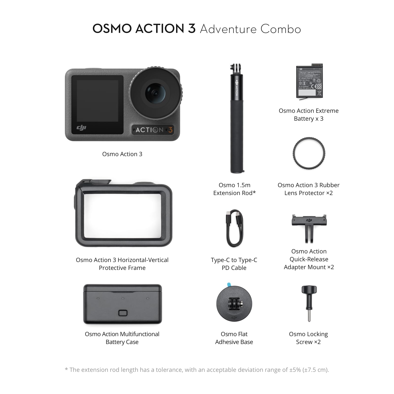 - Osmo Action 3 Adventure Combo - Includes everything in the standard combo as well as a multifunctional battery case, extra batteries, and a 1.5m extension rod for unlimited adventure.