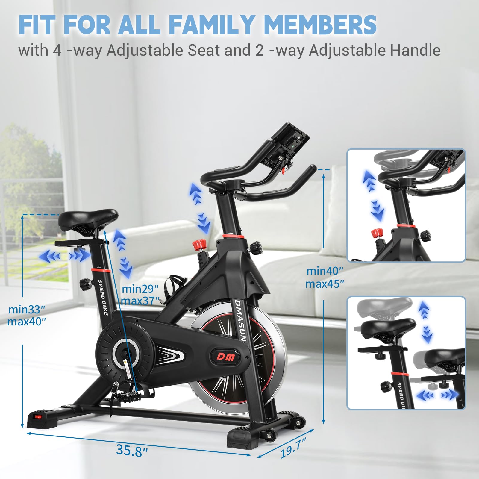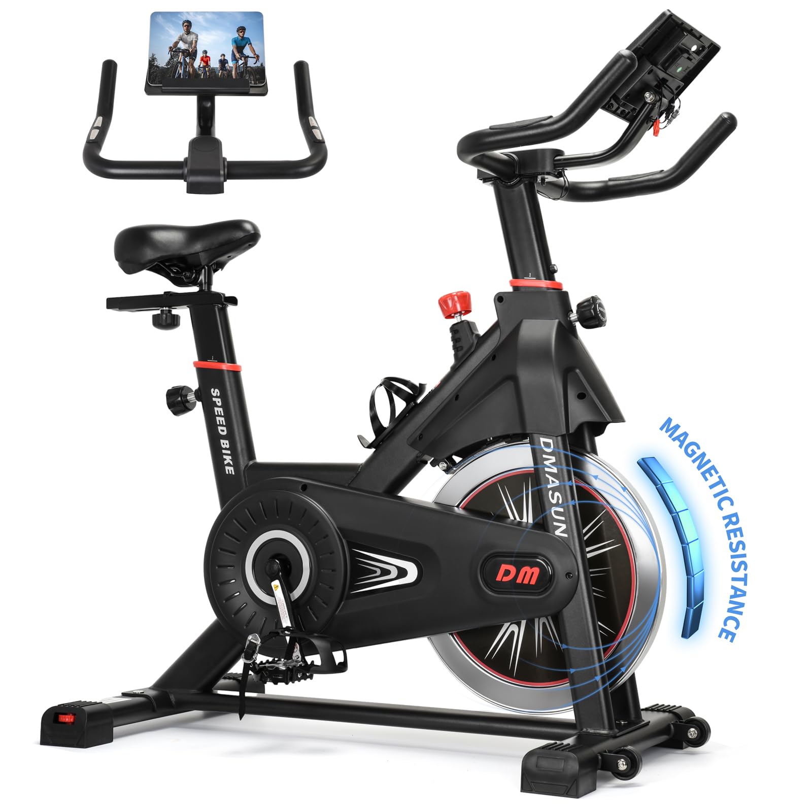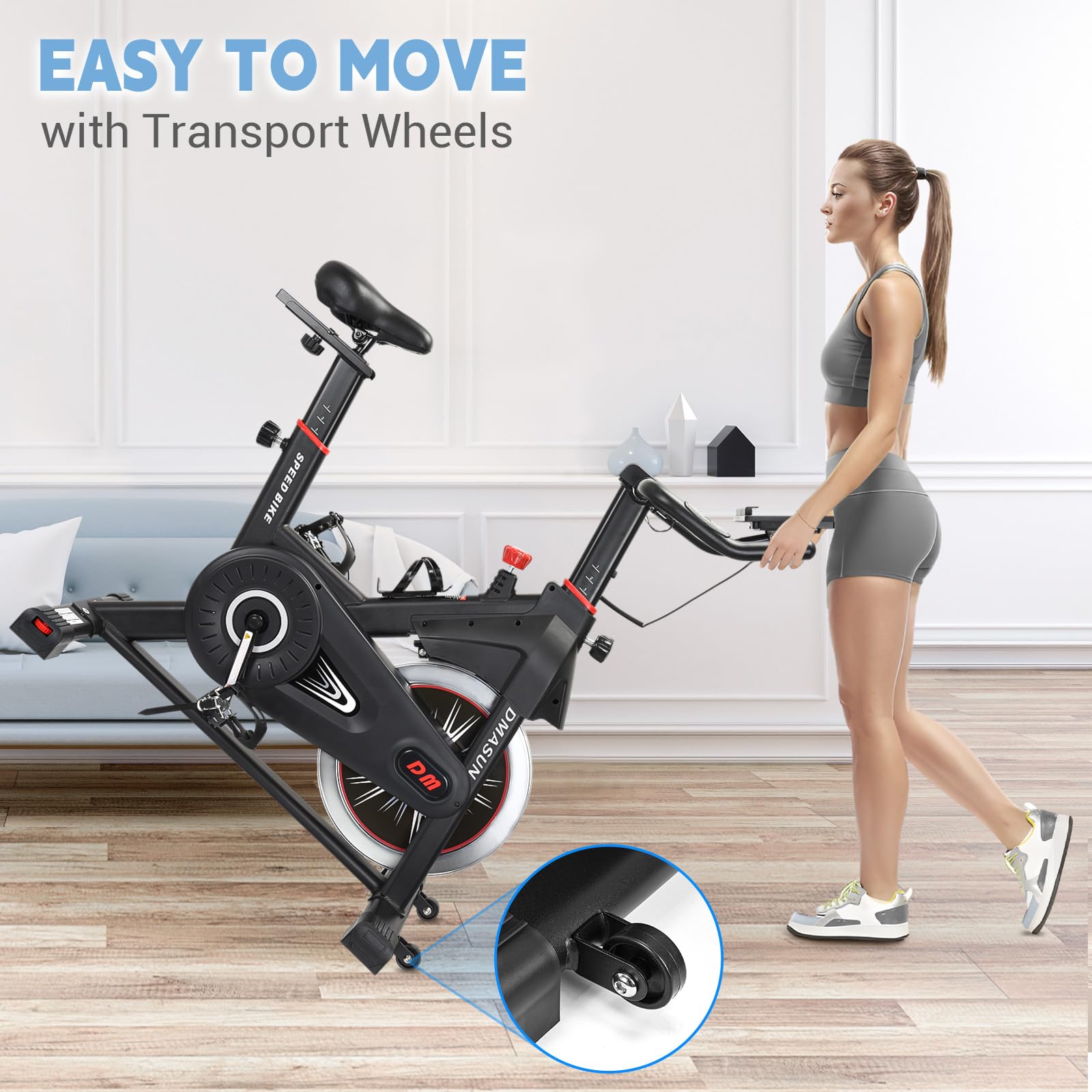 - [Considering Thoughtful Details] DMASUN exercise bikes not only retain the functions of water bottle cage, transport wheels, non -slip cage pedals, horizontal adjustment and other functions. The newly upgraded handlebars will bring you a more comfortable cycling experience, easy -to -read bigger digital display and wider handlebar.